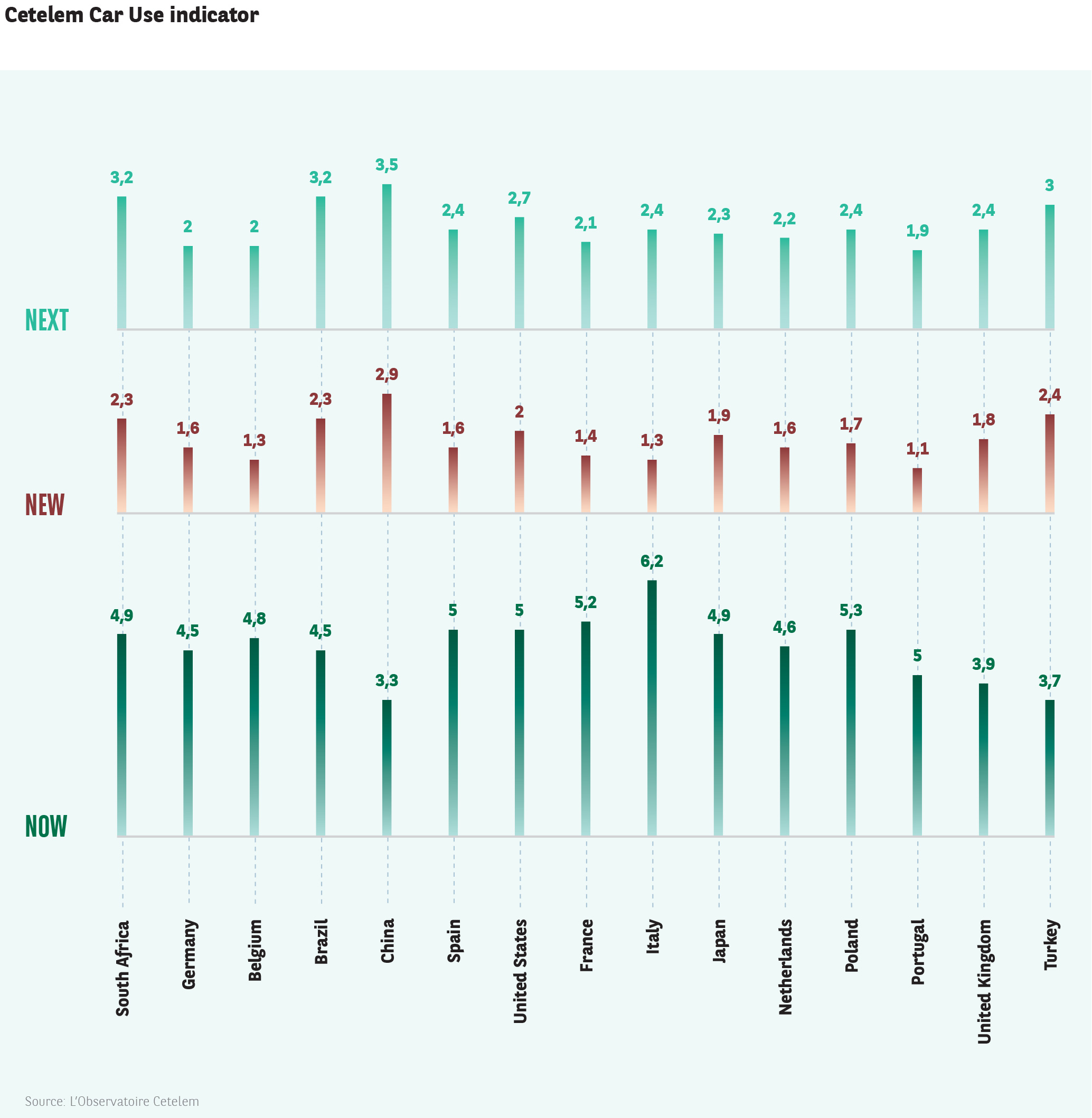 Regarding the Car Use Now indicator, traditional car use is holding up rather well in Western nations. Italy, Poland, France, Portugal, Spain and the United States post indicators that are above or equal to the average. In last place in the ranking, China scores almost half as low as Italy, which comes top (3.3 vs. 6.2). It is worth noting the lowly positions in the ranking of Germany and the United Kingdom, despite their longstanding automotive traditions.