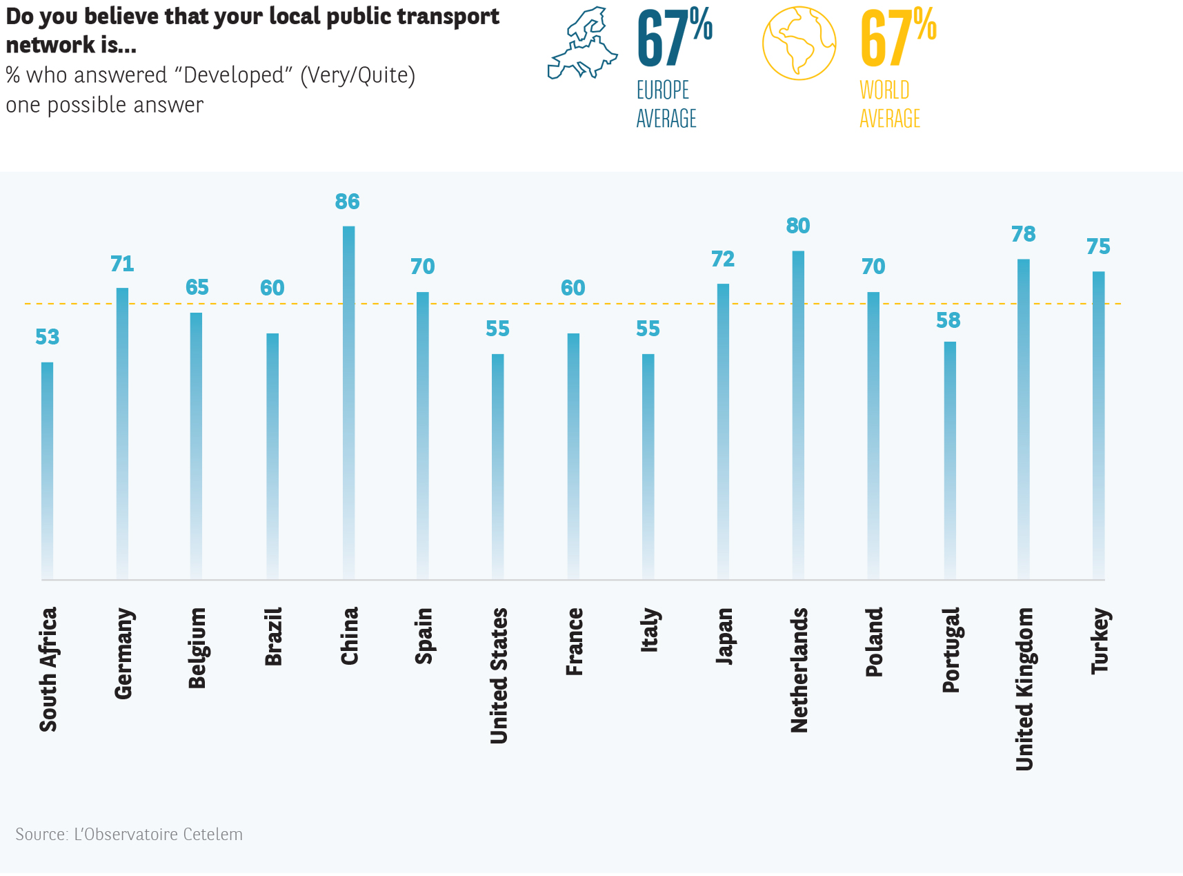 Two-thirds of respondents believe that the public transport network around their home is sufficiently developed, with the Chinese, Dutch and British being the most likely to agree (86%, 80% and 78%). This satisfaction with the public transport system is felt most keenly by urbanites and certain generations. In major cities, the results are almost unanimous, which is the case in Poland (100%!), Germany, China and Japan (96%, 96% and 95%).
