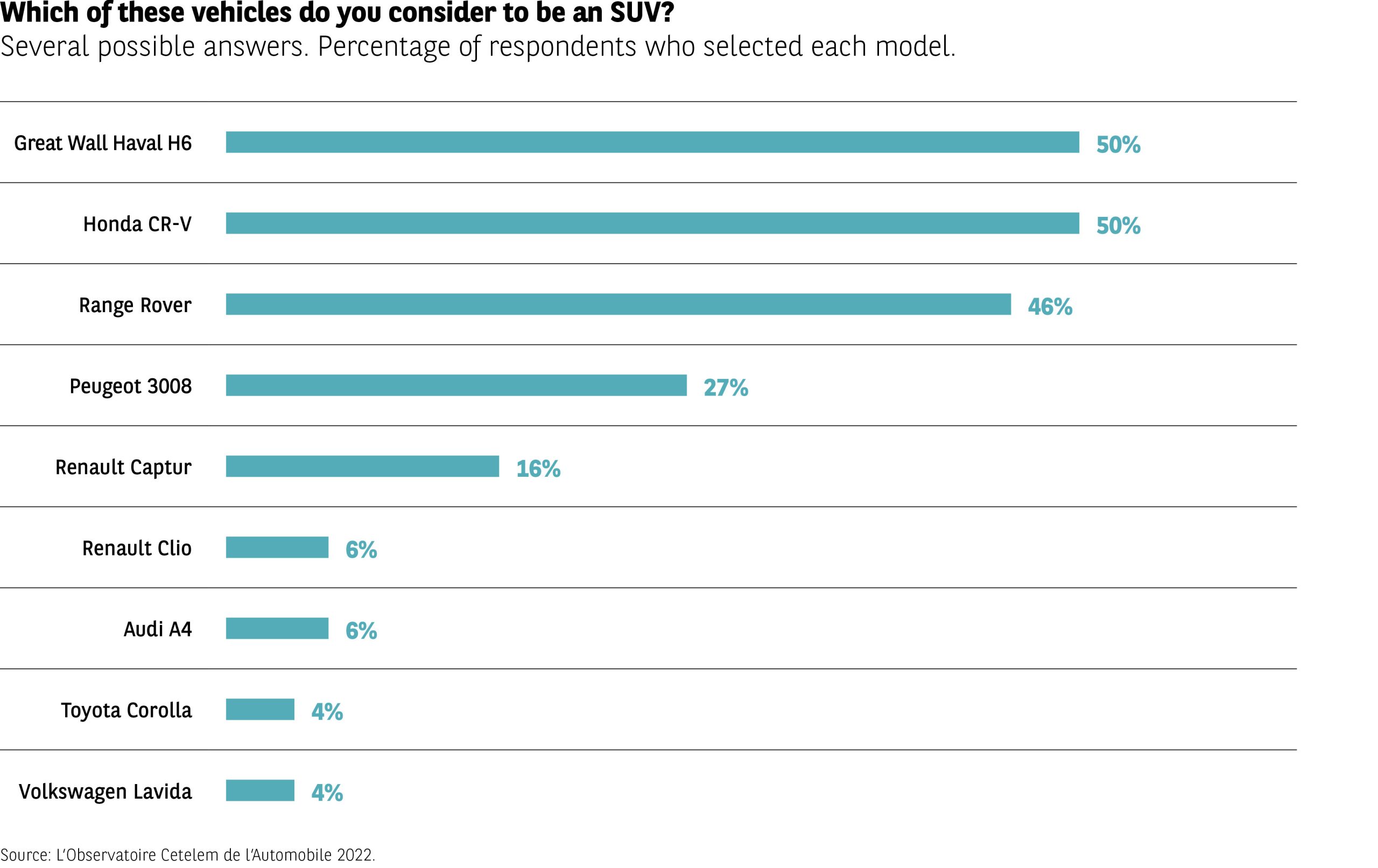 They had no trouble recognising the saloons. More than 9 out of 10 respondents identified them as such. But when it came to identifying the SUVs, they were much less successful. Indeed, while the Greatwall Haval, the Honda CRV and the Range Rover were singled out as SUVs by 1 in 2 respondents, the Peugeot 3008 was only picked by a quarter of those surveyed. And only 16% thought the shape of the Renault Captur resembled that of an SUV.
