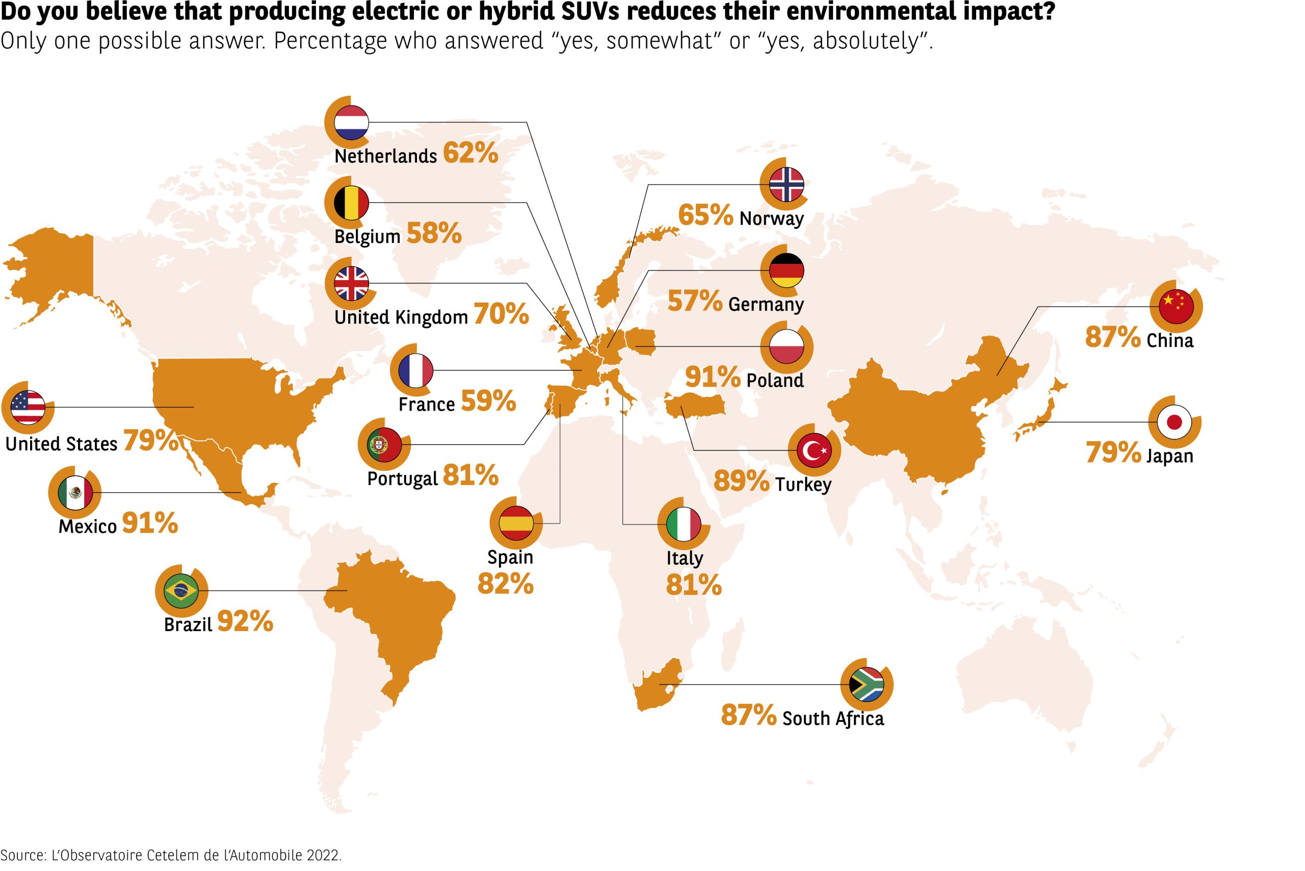 This is a particularly delicate subject in the emerging countries, but also in Italy and Spain. Respondents in the Netherlands, the United Kingdom, Japan and Norway, where the electric car is king, are less troubled by this issue. However, this concern appears to be grounded primarily in financial, rather than environmental interests. Only 23% of SUV owners were hesitant to buy such a vehicle because of its potential environmental impact.