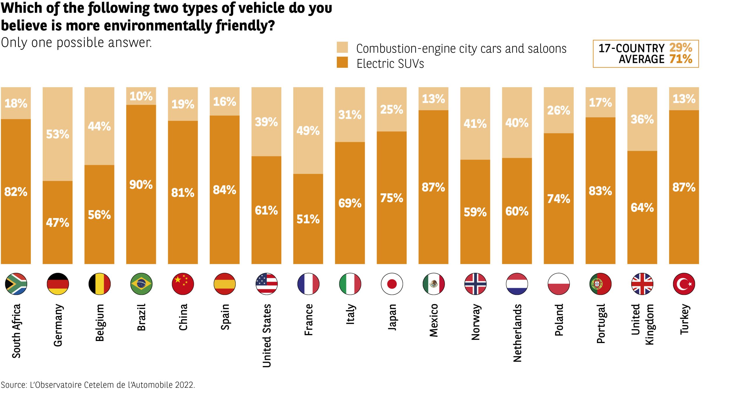 Main takeaway: electric SUVs are considered more environmentally friendly in most countries, with significant variations between regions.