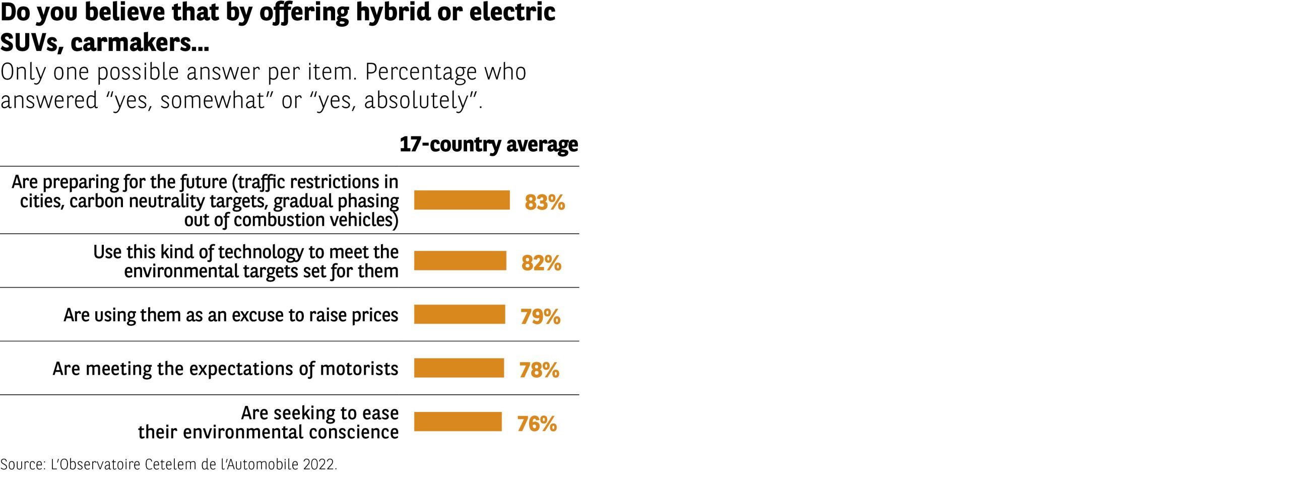 the infographic presents, as a 17-country average, the proportion of respondents who believe manufacturers have different motivations when offering hybrid or electric SUVs. Values include responses “yes, somewhat” and “yes, definitely.”