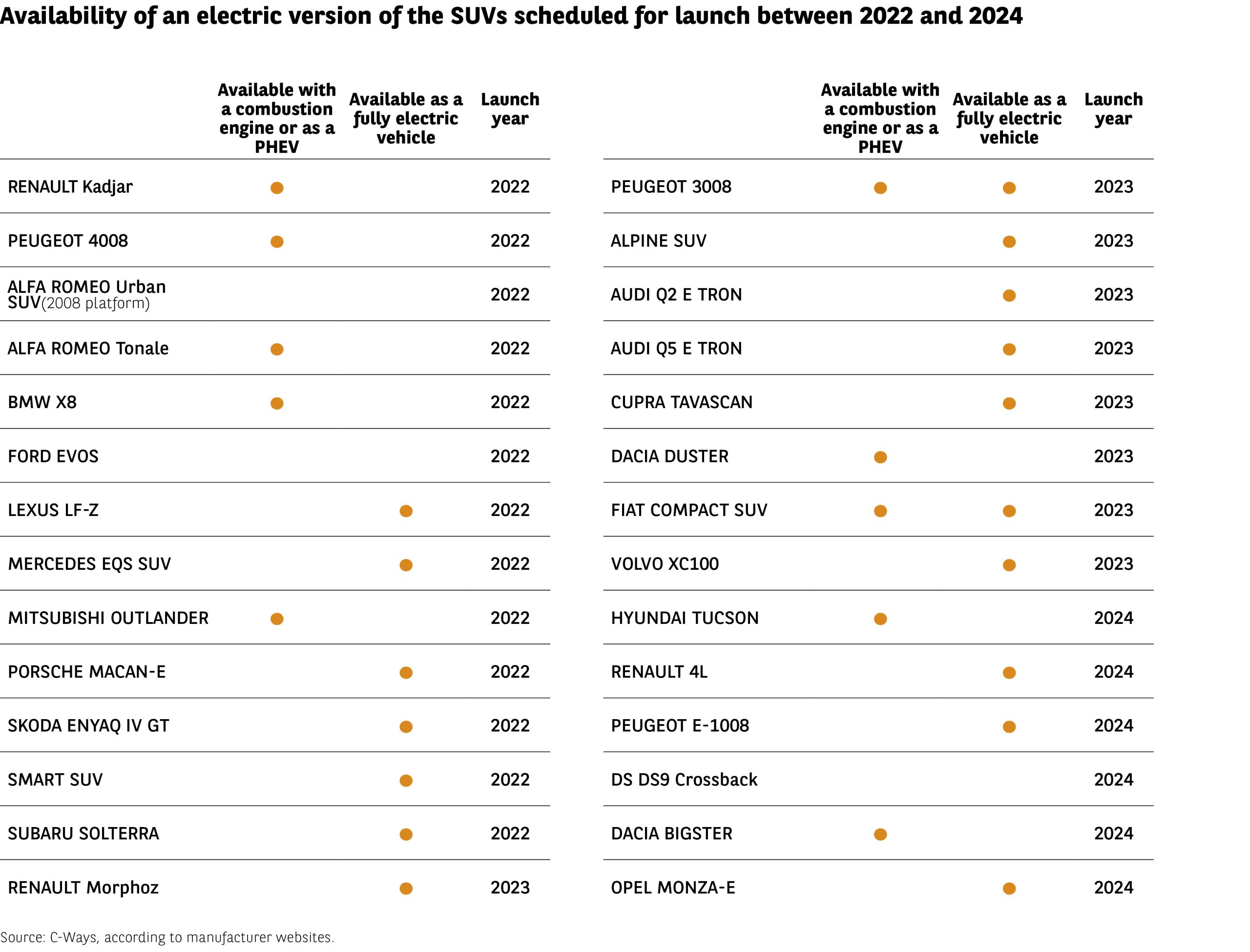 the table presents SUV models scheduled for release between 2022 and 2024. For each model, the graphic indicates whether a thermal/PHEV version exists, whether a fully electric version exists, and the planned release year.