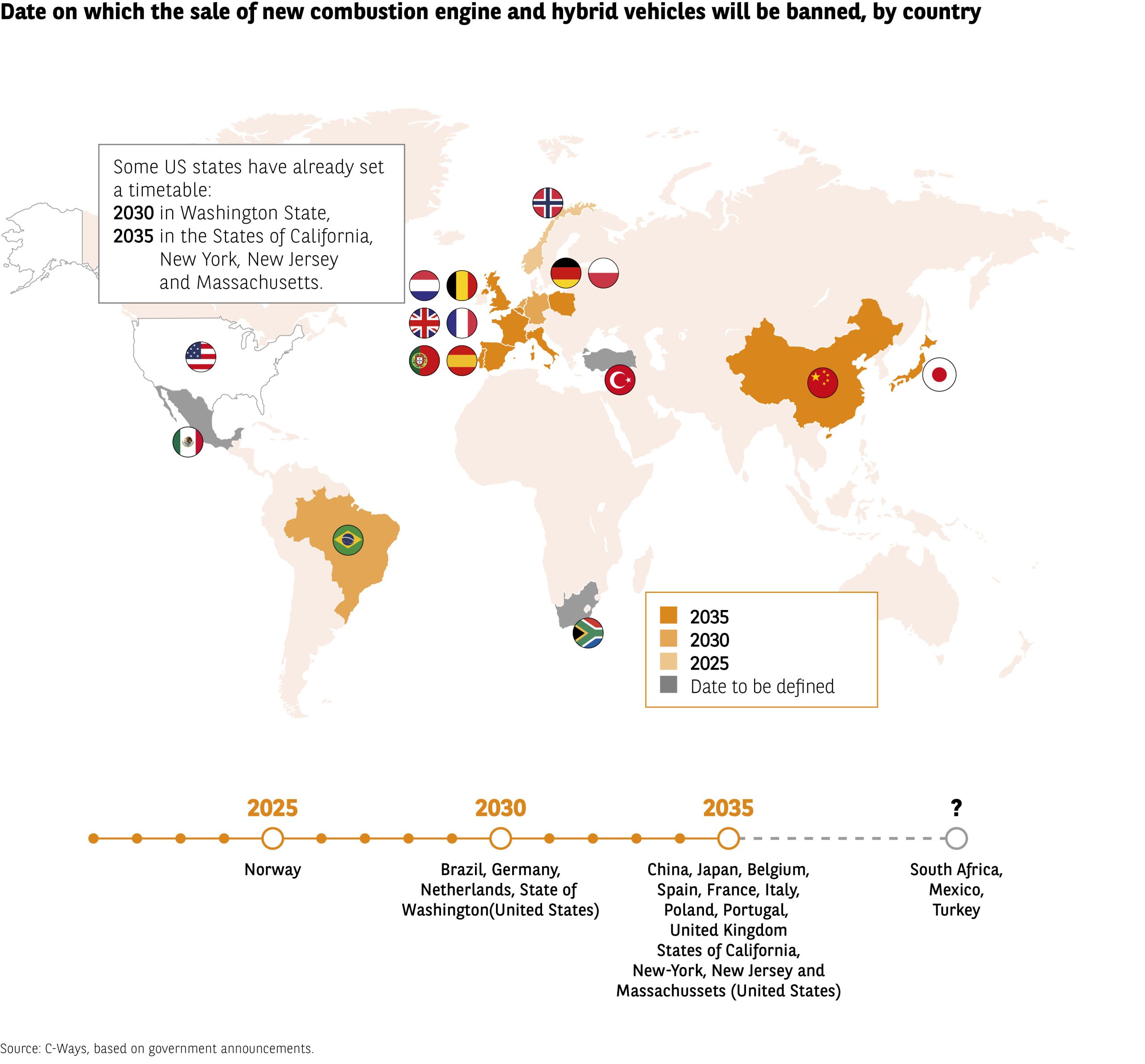 the map presents the announced timelines by various countries regarding the end of new combustion or hybrid vehicle sales. Countries are grouped into three deadlines—2025, 2030, and 2035.