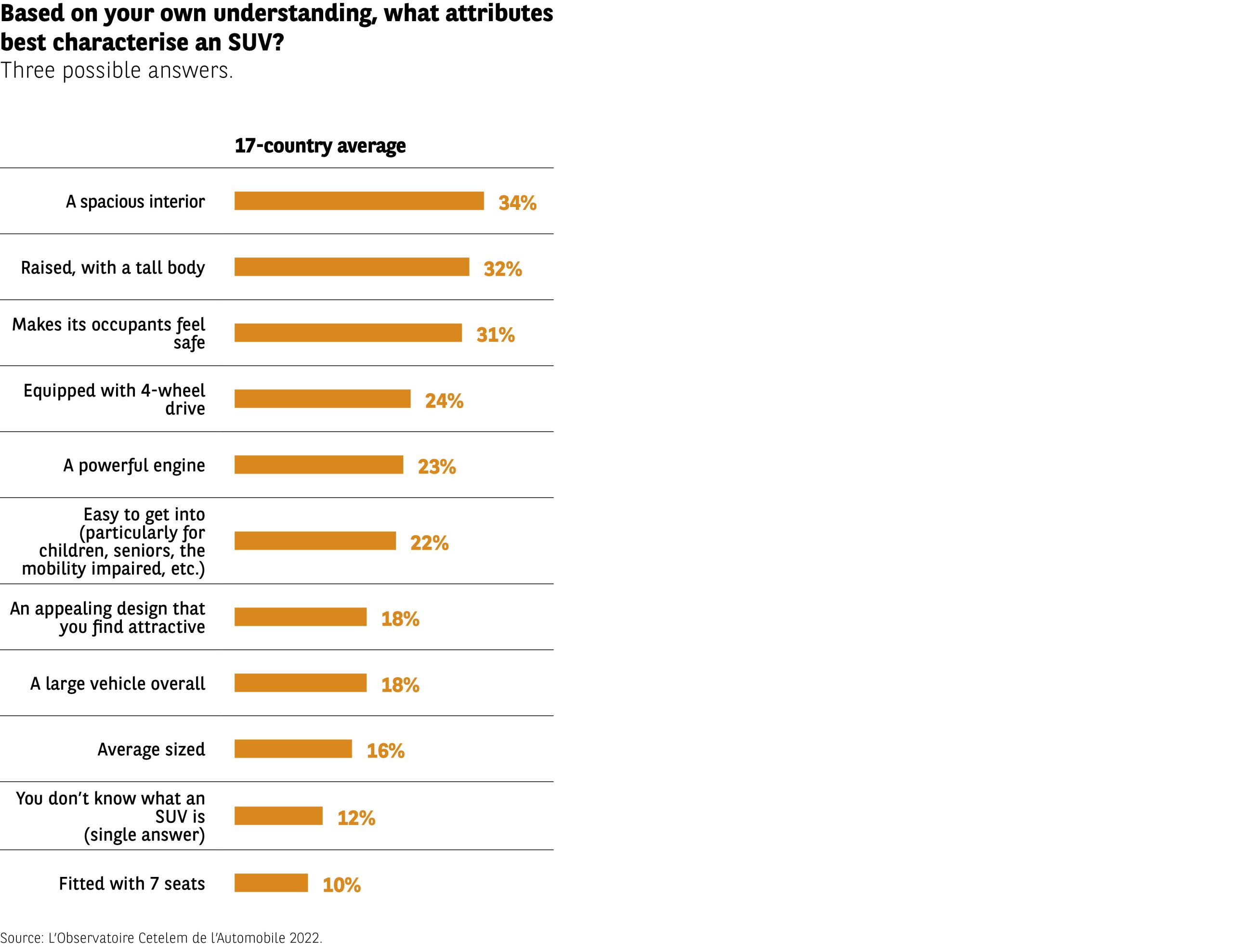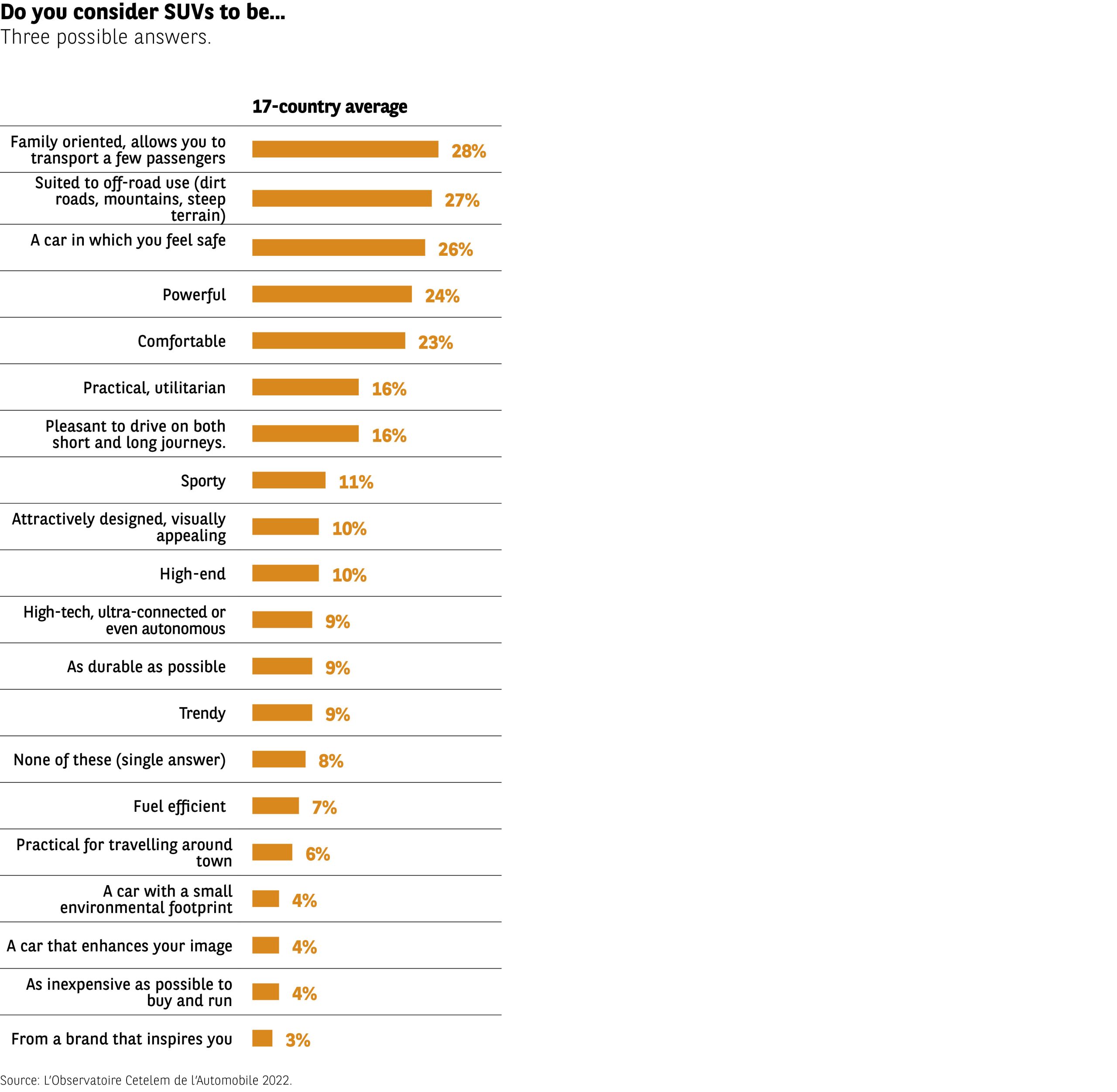 the infographic shows which attributes respondents associate with SUVs. Up to three answers allowed. Results reflect averages across 17 countries.