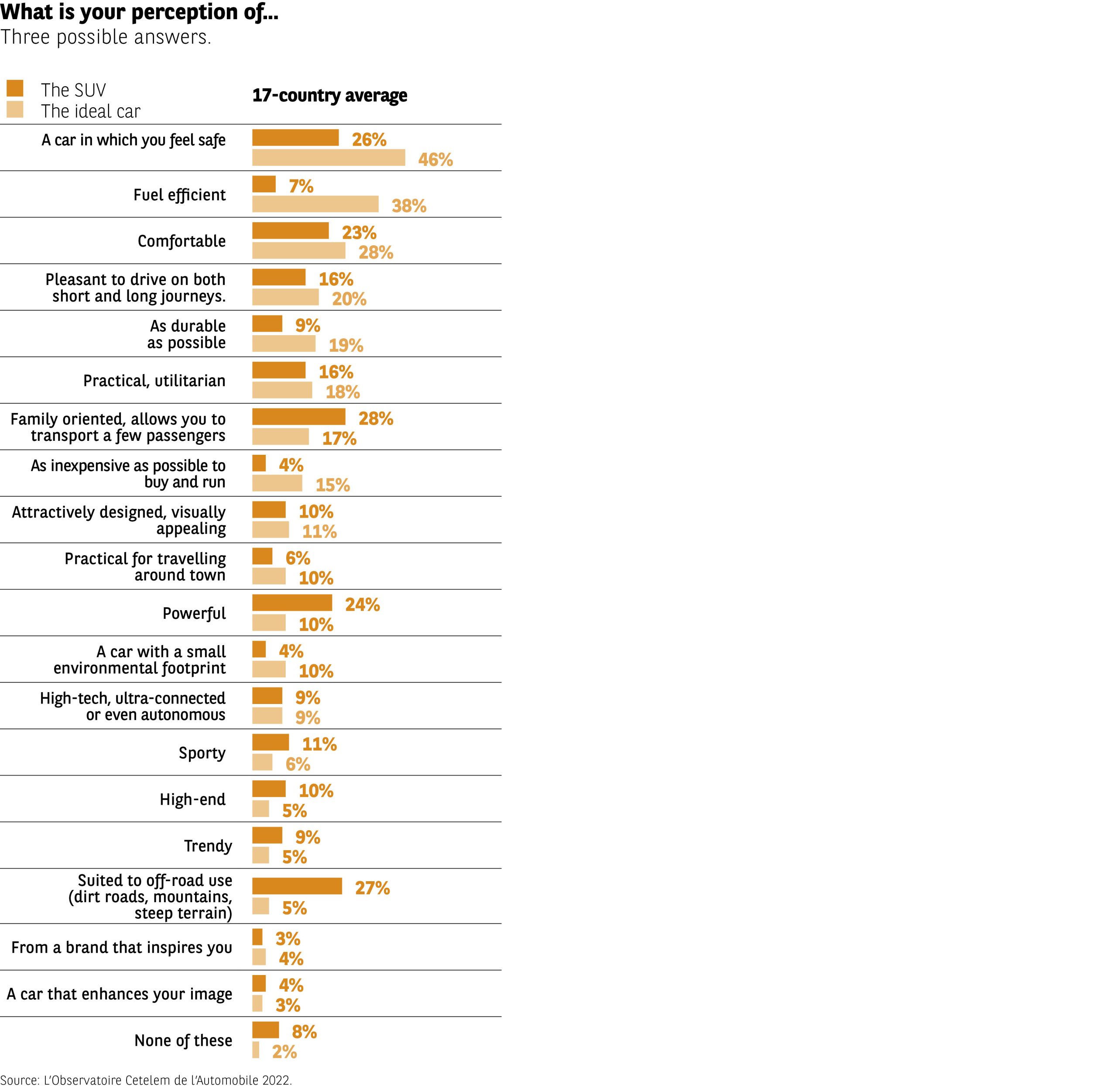 Indeed, SUVs are family cars in the opinion of 28% of those surveyed, while only 17% believe the same can be said of the ideal vehicle. And this is also true of certain other criteria: while 24% consider SUVs to be powerful vehicles, only 10% think that the ideal vehicle is also powerful. Conversely, 15% believe that the ideal car would cost as little as possible to buy and use, while just 4% think that SUVs meet these criteria. Only three items generate practically identical scores on both sides, three of which relate to style and design.