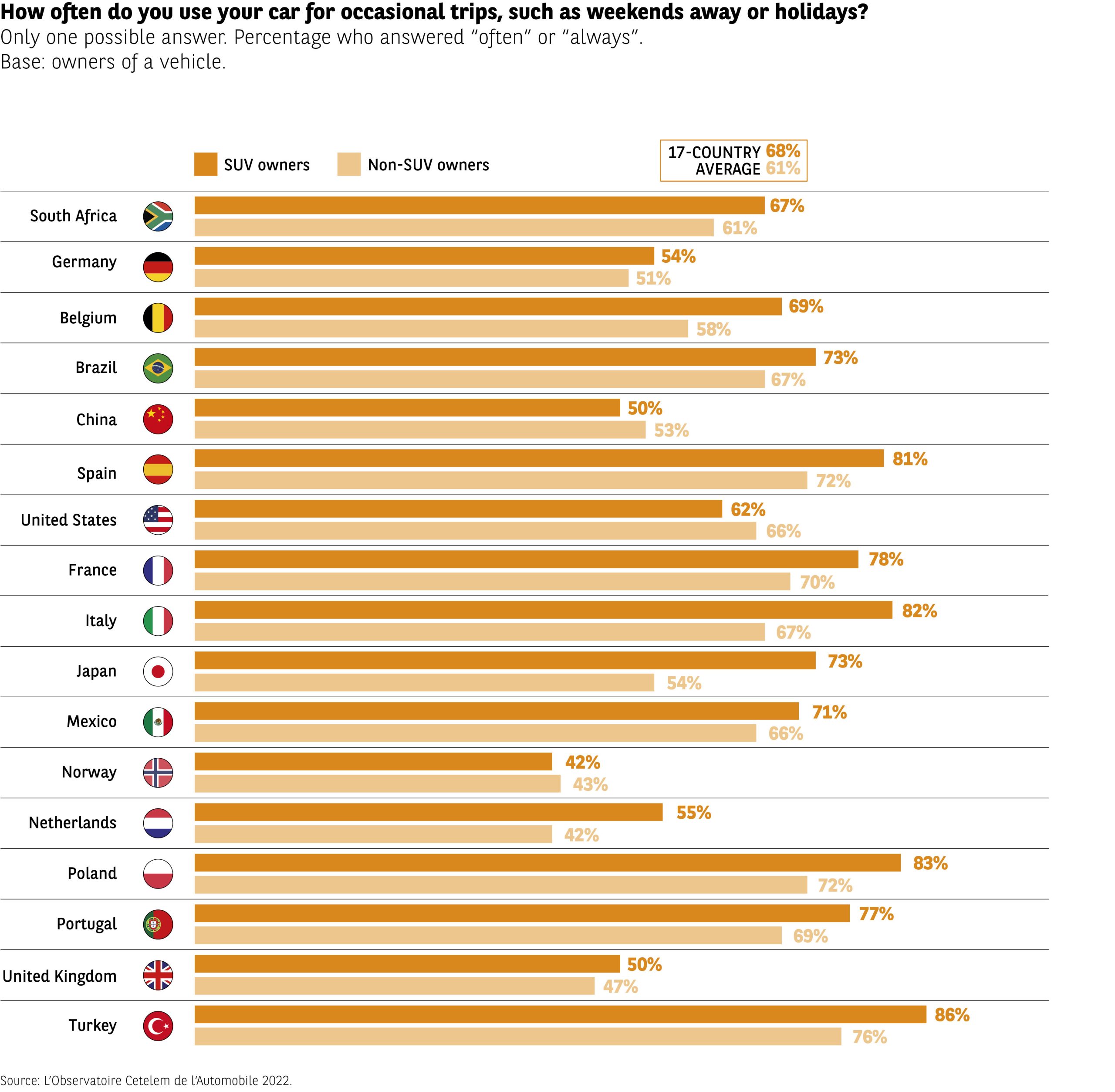 Main takeaway: SUV owners generally report higher leisure-trip usage, with some variations by country.