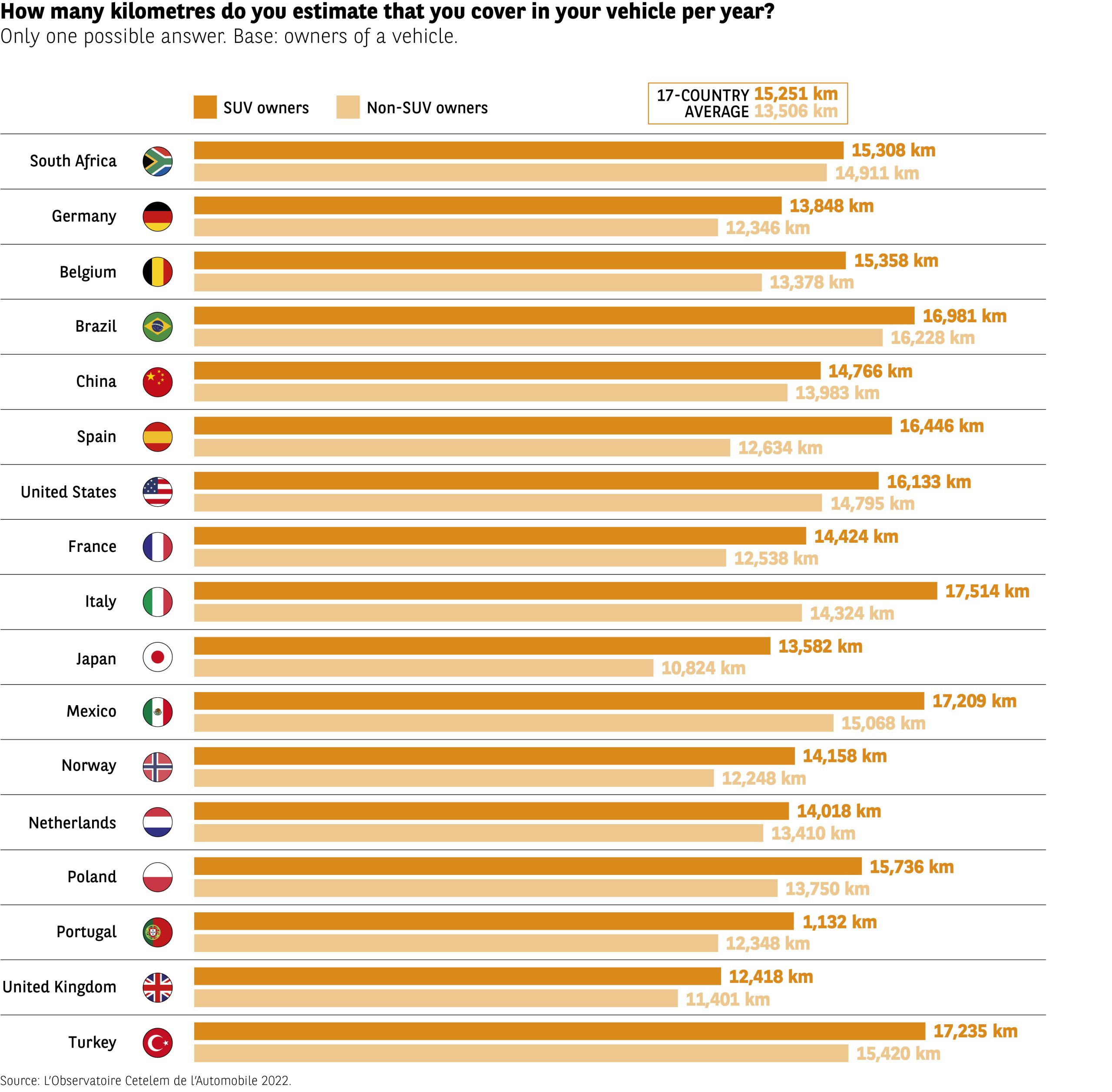 the infographic displays, for 17 countries, the number of kilometers respondents believe they drive per year. Two groups are shown: SUV owners and non-owners.