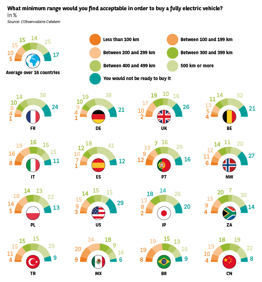 In theory, battery life should not be an obstacle because 86% of those who replied cover less than 100 km per day. While an electric vehicle may be suitable for most of these motorists, the limit on the range, the journey planning, battery charge management and anxiety about running out of charge outweigh the benefits for many users. The barrier is therefore attributable to psychological factors more than functional features. The reluctance to embrace the electric vehicle will remain strong as long as there is no significant improvement in battery life. 40% of motorists claim that they would only be ready to buy an electric vehicle when the range exceeds 400 km.
