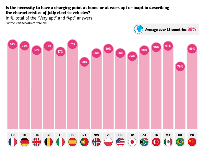 Given the battery life limitations, the need to have regular access to a charging station is important. 88% of those who replied associate electric vehicle use with the need to have access to a charging point at home or at work.
