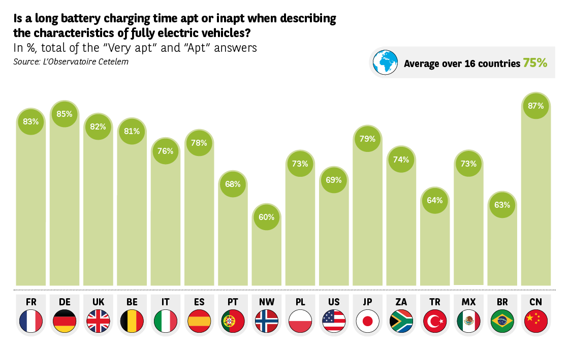 Whether at home or in a public space, the issue of the battery charging time is paramount. 75% of those who replied associate the electric vehicle with a long battery charging time