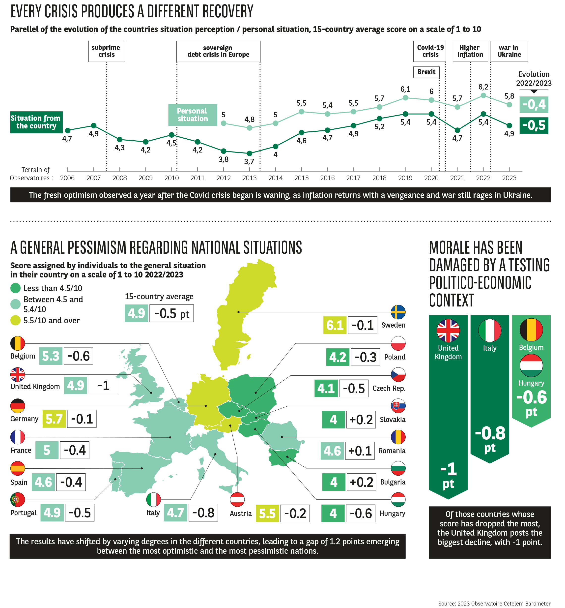 The three countries that post the biggest decline in terms of perceptions of their national situation are the United Kingdom, Italy and Belgium (-1 point, -0.8 point and -0.6 point, respectively), which cannot be described as being even close to bordering Russia. Moreover, Slovakia, Romania and Bulgaria, which are much closer, are the only countries in which this score has improved (by 0.2 points, 0.2 points and 0.1 points, respectively). What this confirms is that local factors take precedence over global issues for this particular metric. The UK endured a particularly tumultuous summer and autumn, the latter having been marked by the sudden and unprecedented fall of the Liz Truss government. On 22 September, the Fratelli d’Italia party won the most votes in the Italian elections.