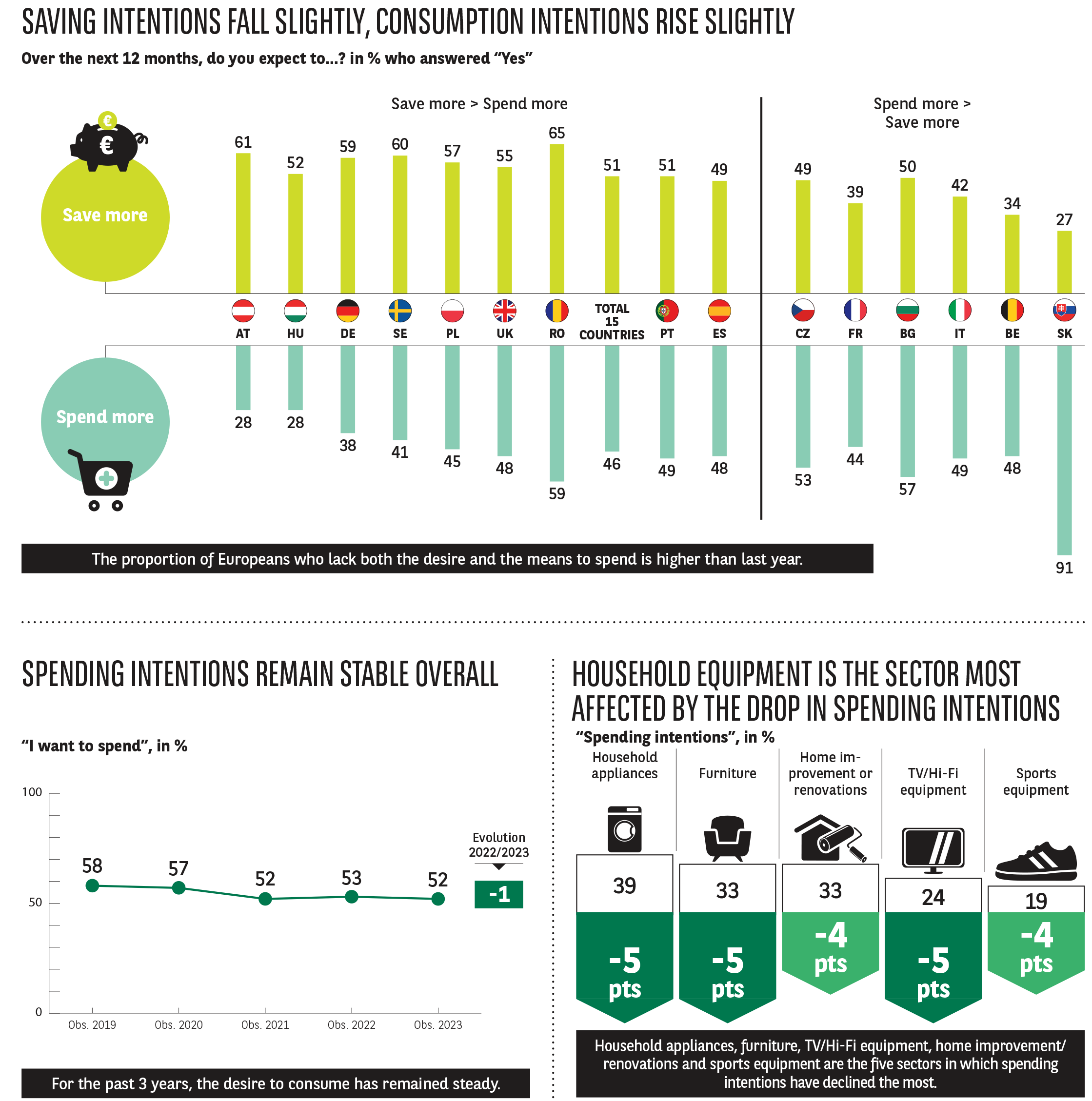 At a time of such uncertainty, with inflation reaching a level not seen for decades and purchasing power declining, one might have expected Europeans to alter their strategy when it comes to saving and spending. But that is not borne out in reality. On average, saving intentions have fallen by 3 points, while spending intentions are heading in the opposite direction, having risen by 5 points.