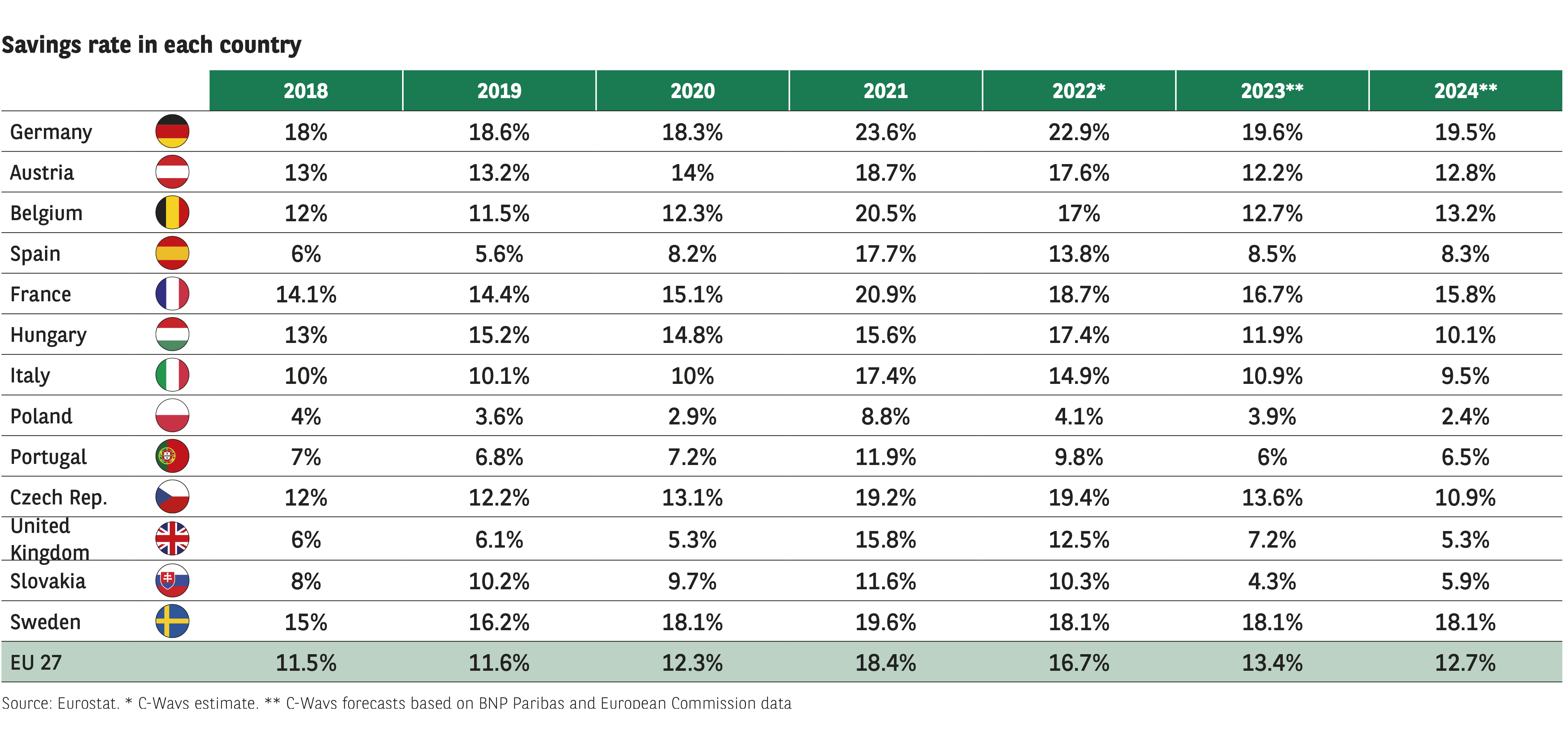 On the topic of savings, it is worth remembering, first of all, that subsequent to the Covid crisis the savings rate increased spectacularly between 2020 and 2021 in every country surveyed, in some cases doubling or even tripling, as was the case in Spain and Poland. These “glass ceilings” are difficult to break through.