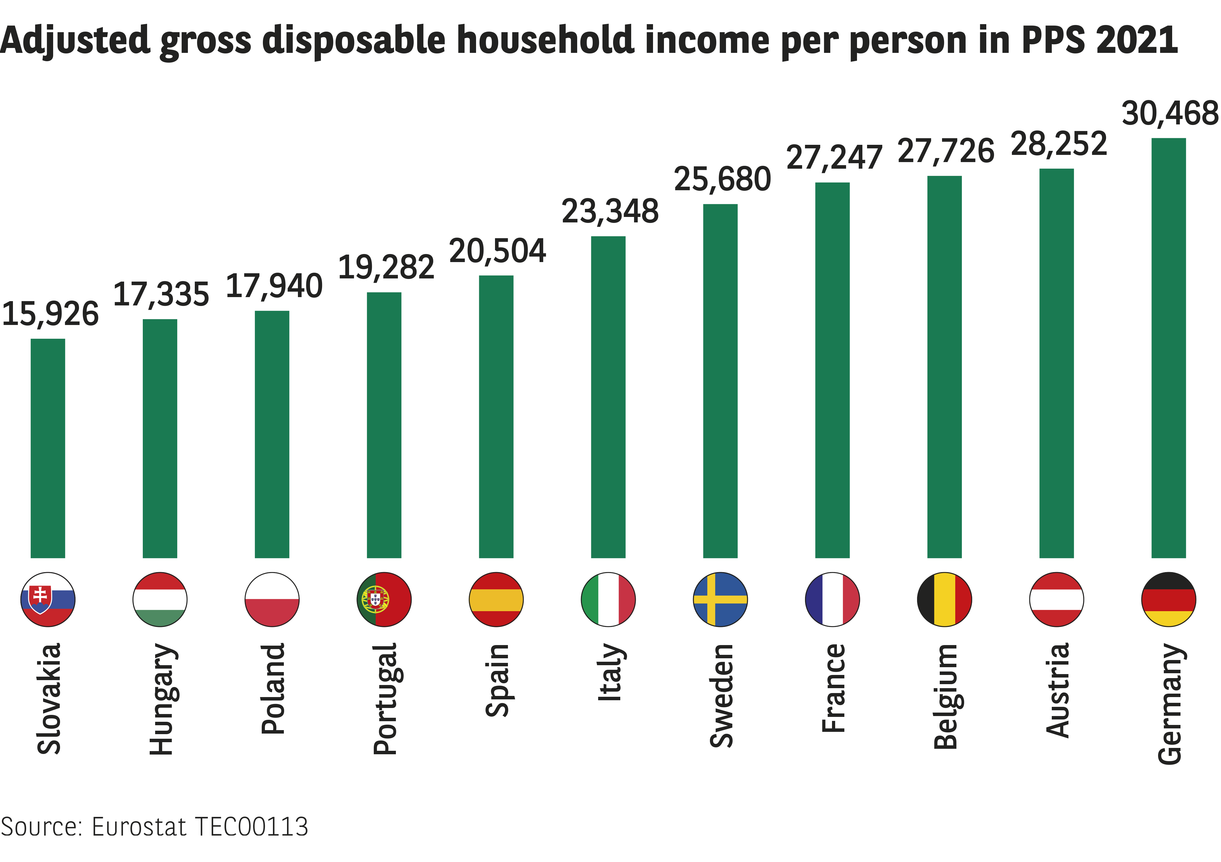 Adjusted gross disposable household income per person, expressed in PPS, is calculated by dividing the adjusted gross disposable income of households and non-profit institutions serving households (NPIs) by the purchasing power parities (PPPs) of actual individual household consumption and by the total resident population.