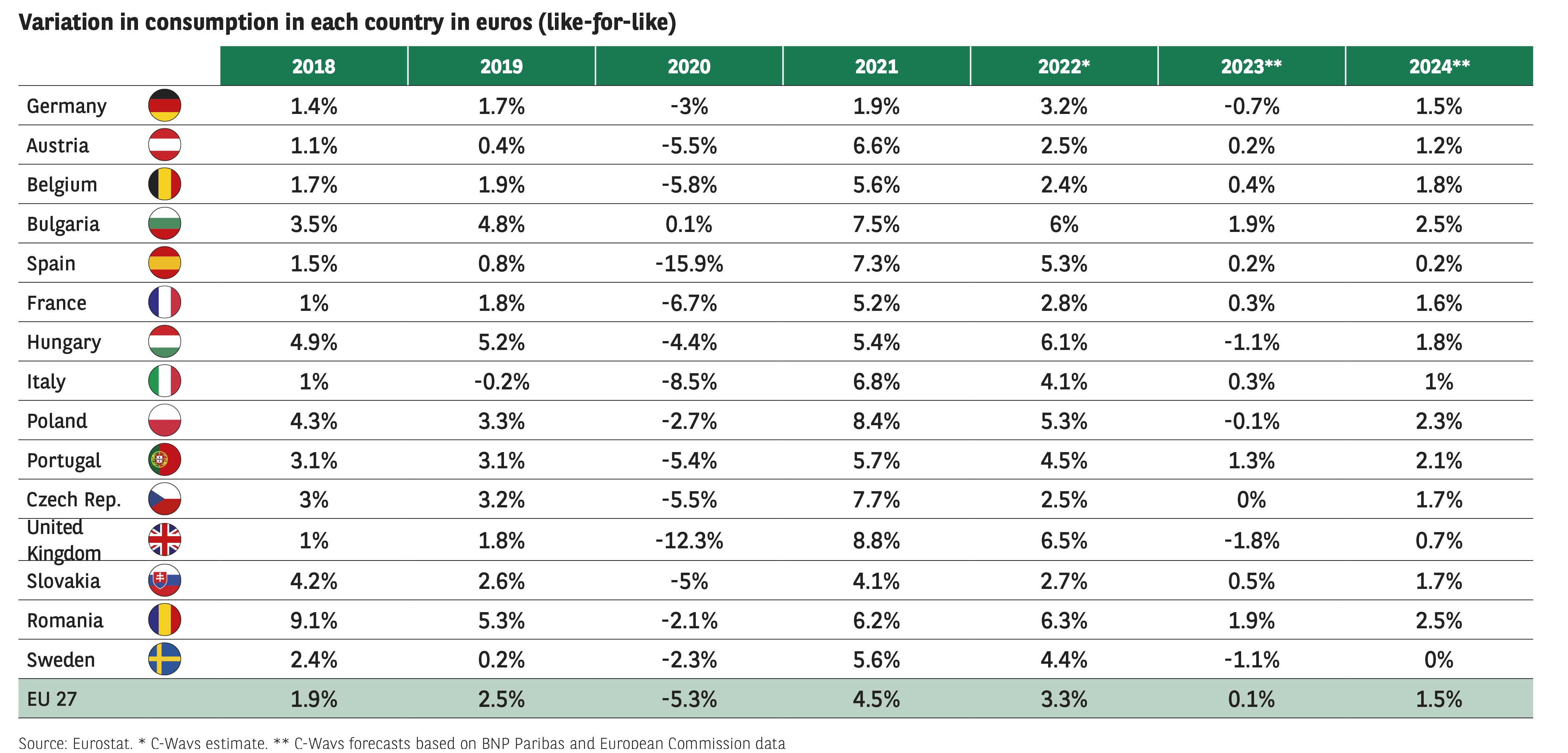 After the post-Covid recovery of 2022 (+3.3% in Europe), real consumption levels will stagnate in 2023 as a result of this pressure.