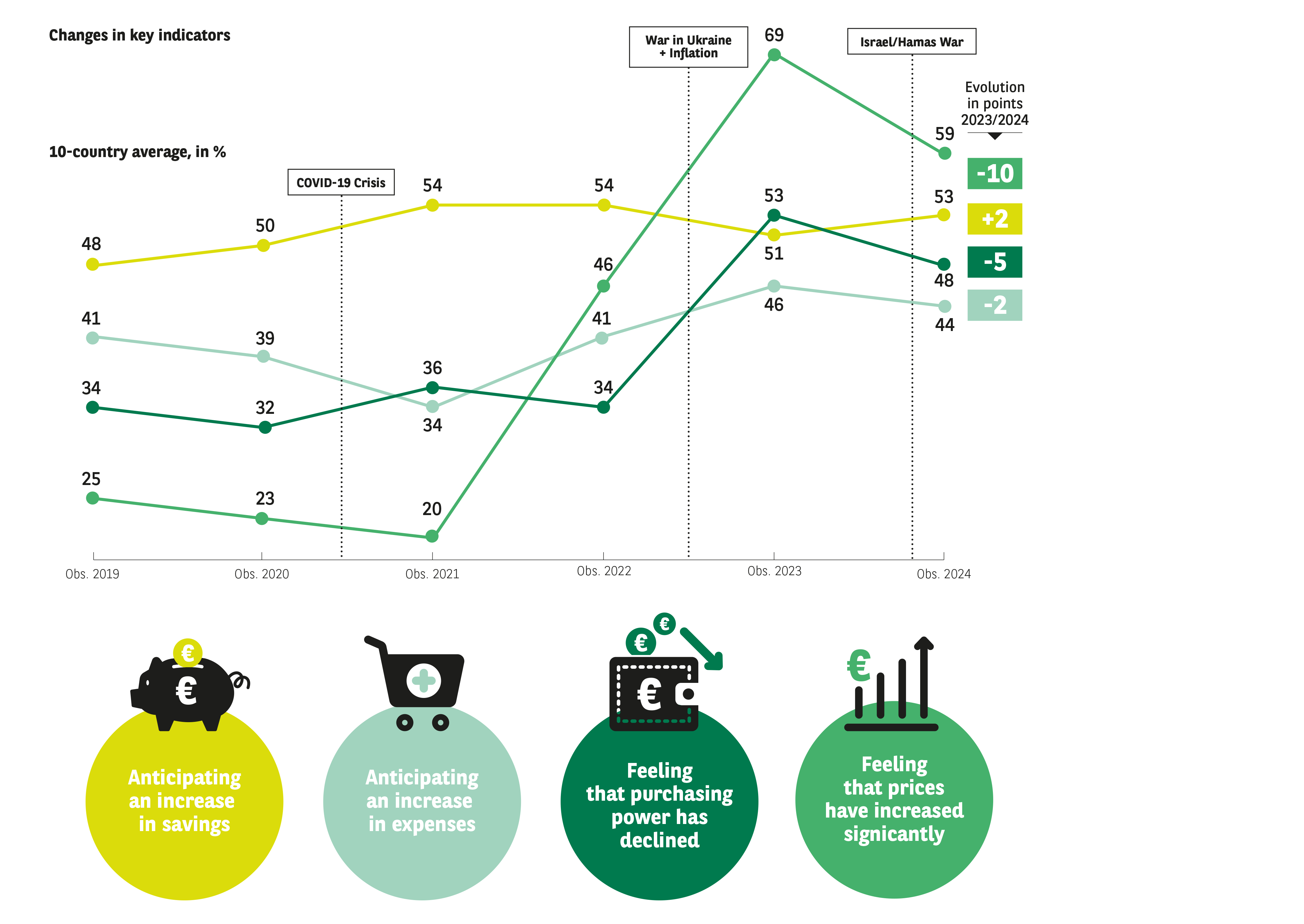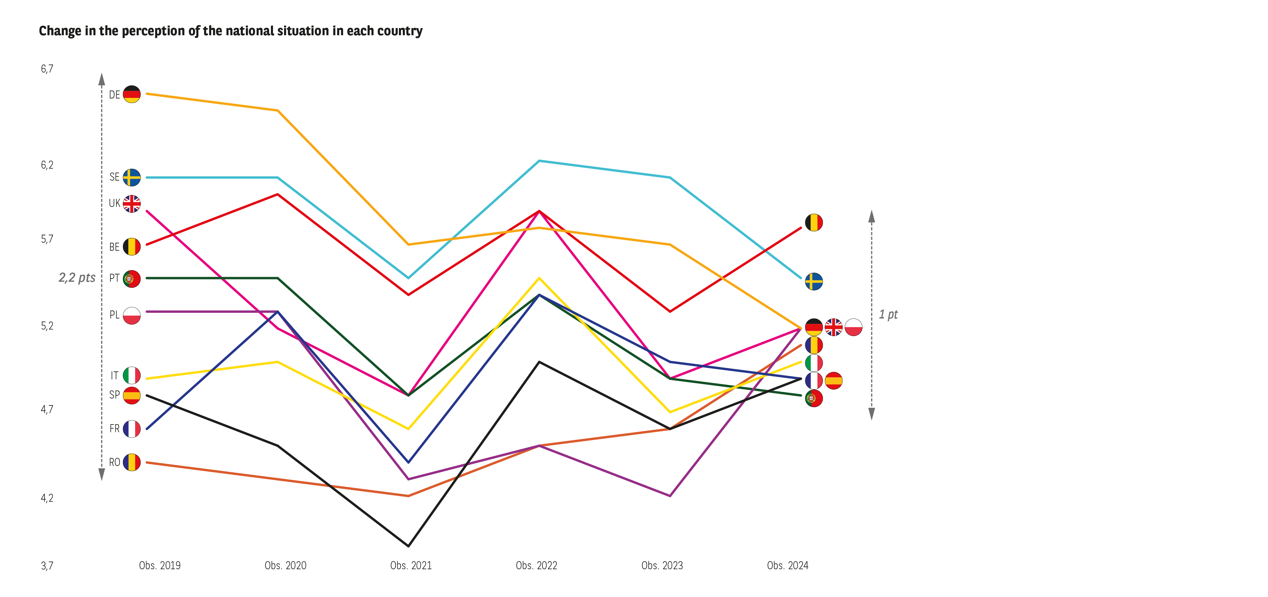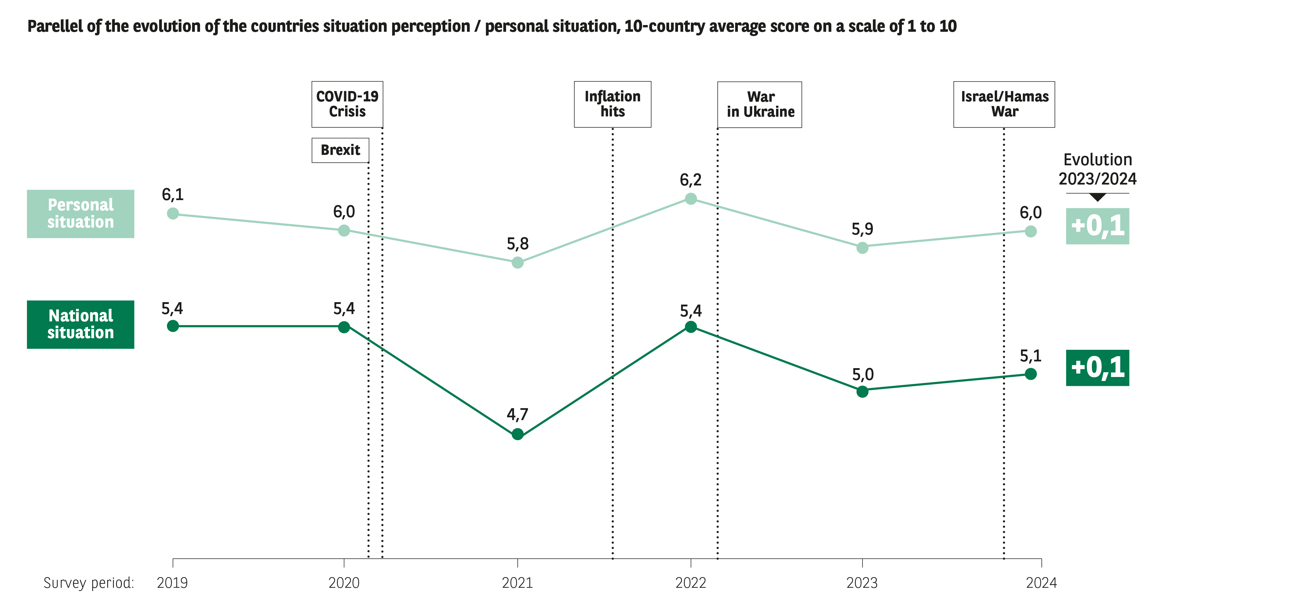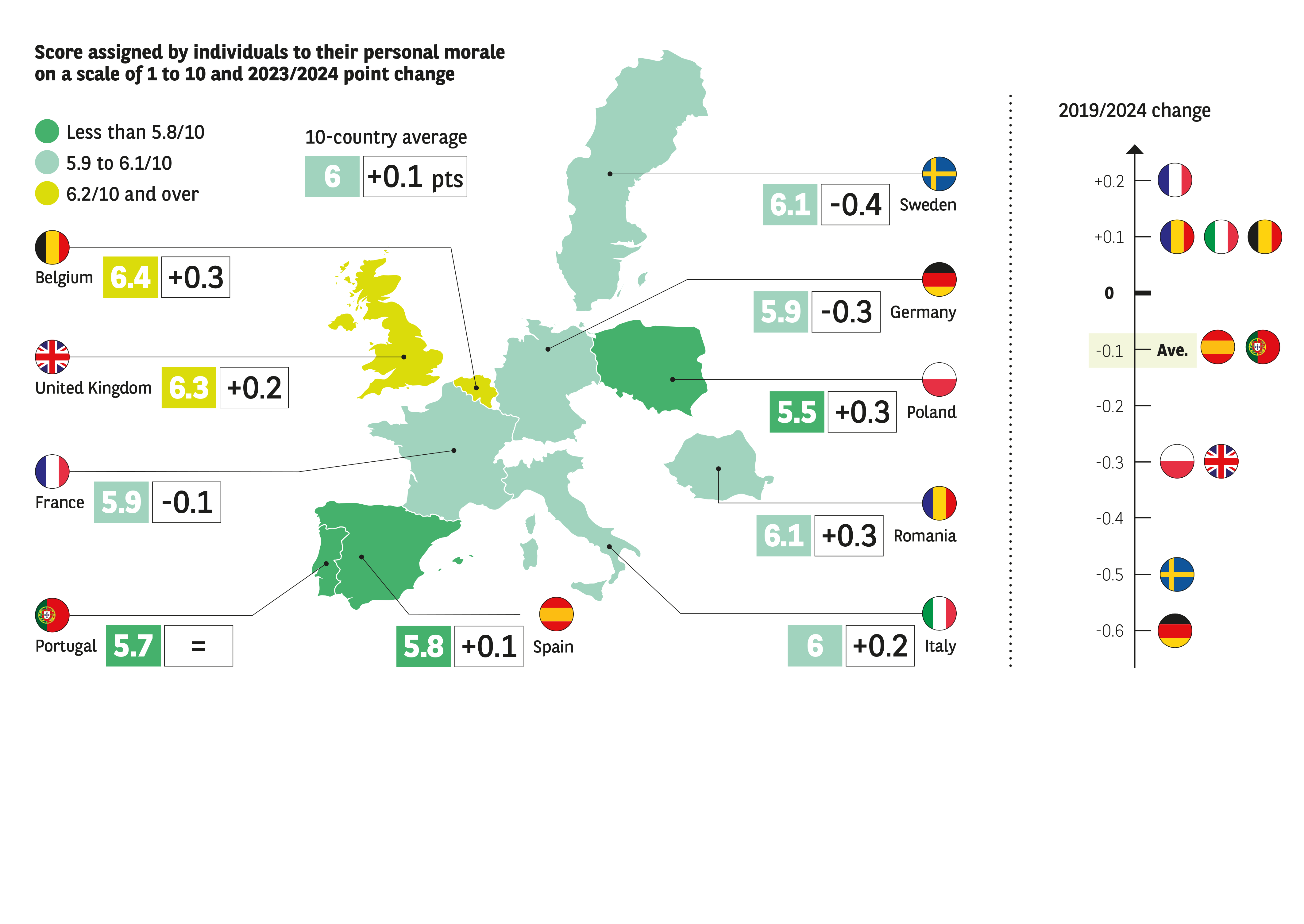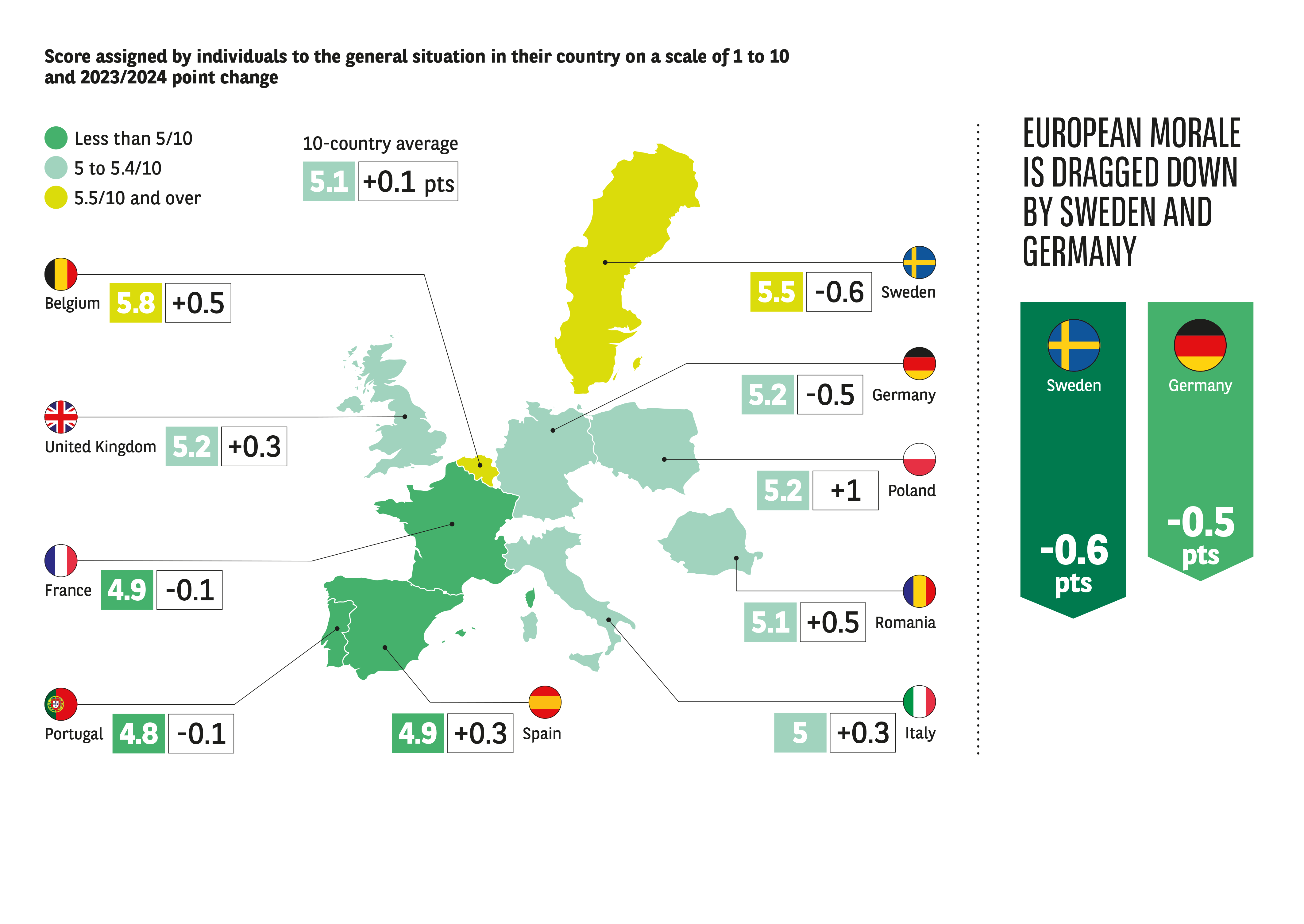 Last year, after a “euphoric” post-pandemic rebound, morale among Europeans once again deteriorated overall. In the ten countries surveyed, the scores for both national situations and personal circumstances fell. The upturn was evidently condemned to be brief and the economic indicators have rendered the short- and medium-term outlook somewhat gloomy.