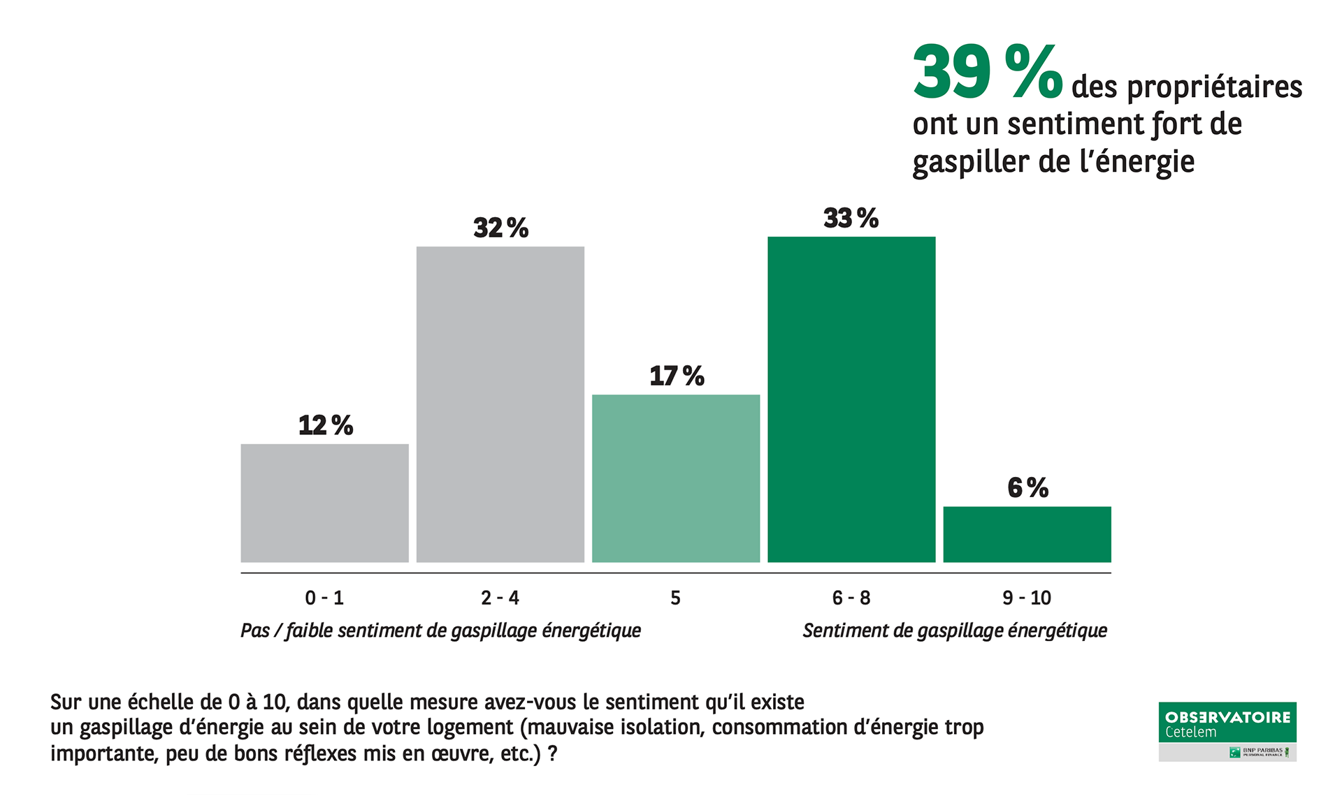 Une mention indique que 39 % des propriétaires ont un sentiment fort de gaspiller de l’énergie, correspondant aux personnes ayant attribué un score entre 6 et 10.