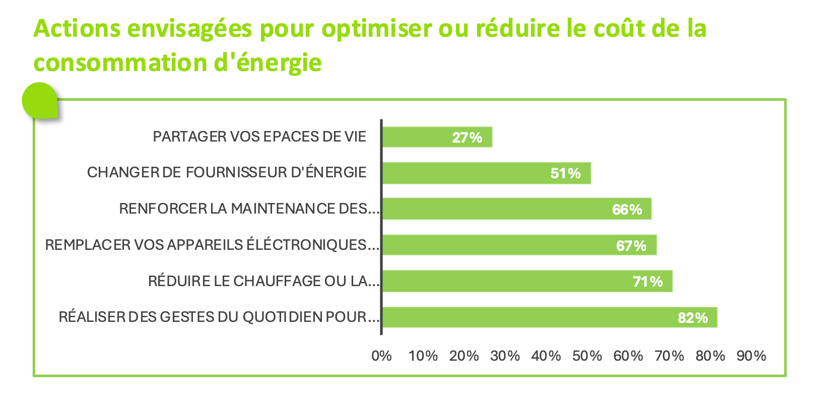 Classe les actions envisagées pour diminuer la consommation d’énergie Le visuel présente un histogramme horizontal décrivant plusieurs actions que les répondants envisagent pour optimiser ou réduire le coût de leur consommation d’énergie. Les données affichées sont : Partager vos espaces de vie : 27 %. Changer de fournisseur d’énergie : 51 %. Renforcer la maintenance des équipements : 66 %. Remplacer vos appareils électroniques : 67 %. Réduire le chauffage ou la climatisation : 71 %. Réaliser des gestes du quotidien pour économiser : 82 %. Les gestes du quotidien et la réduction chauffage/climatisation apparaissent comme les actions les plus fréquemment envisagées.