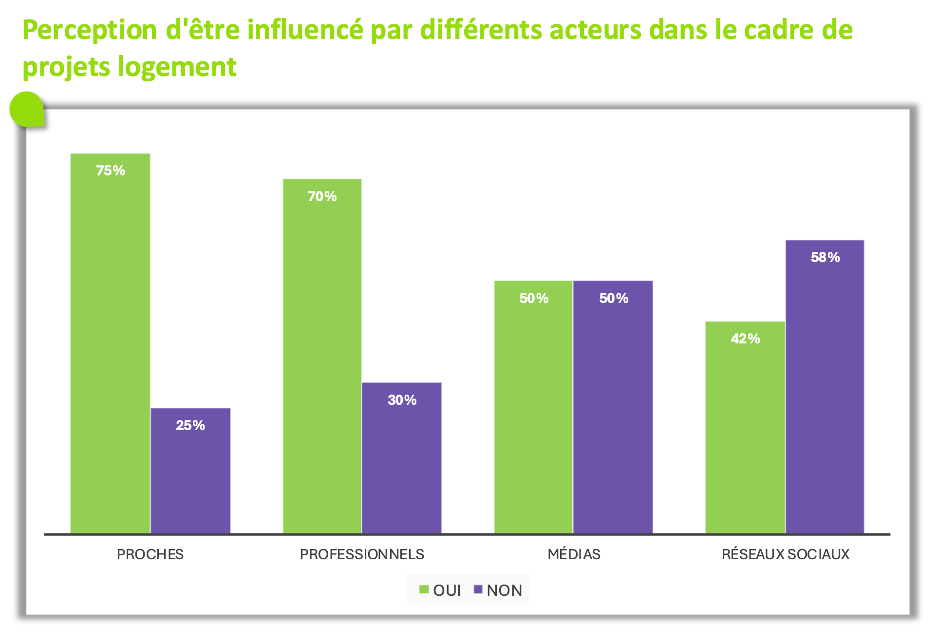 Compare la part de personnes se disant influencées par proches, professionnels, médias et réseaux sociaux L’infographie présente un histogramme comparant la proportion de personnes qui déclarent être influencées ou non par différents acteurs lors de projets liés au logement. Les données indiquées sont : Proches : 75 % oui, 25 % non. Professionnels : 70 % oui, 30 % non. Médias : 50 % oui, 50 % non. Réseaux sociaux : 42 % oui, 58 % non. Les proches et les professionnels sont perçus comme les sources d’influence les plus fréquentes, tandis que les réseaux sociaux apparaissent comme l’acteur le moins influent.
