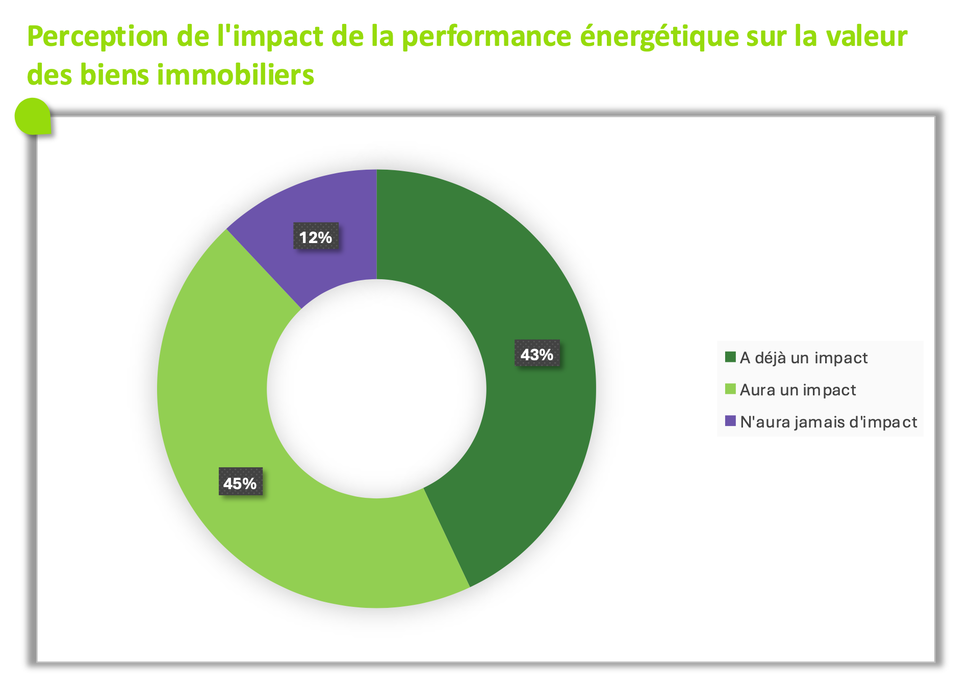 Indique si la performance énergétique influence ou non la valeur des biens immobiliers L’image présente un diagramme en anneau illustrant la perception de l’impact de la performance énergétique sur la valeur d’un bien immobilier. Les données sont : A déjà un impact : 43 %. Aura un impact : 45 %. N’aura jamais d’impact : 12 %. La majorité estime que la performance énergétique influence déjà, ou influencera à l’avenir, la valeur d’un bien immobilier.