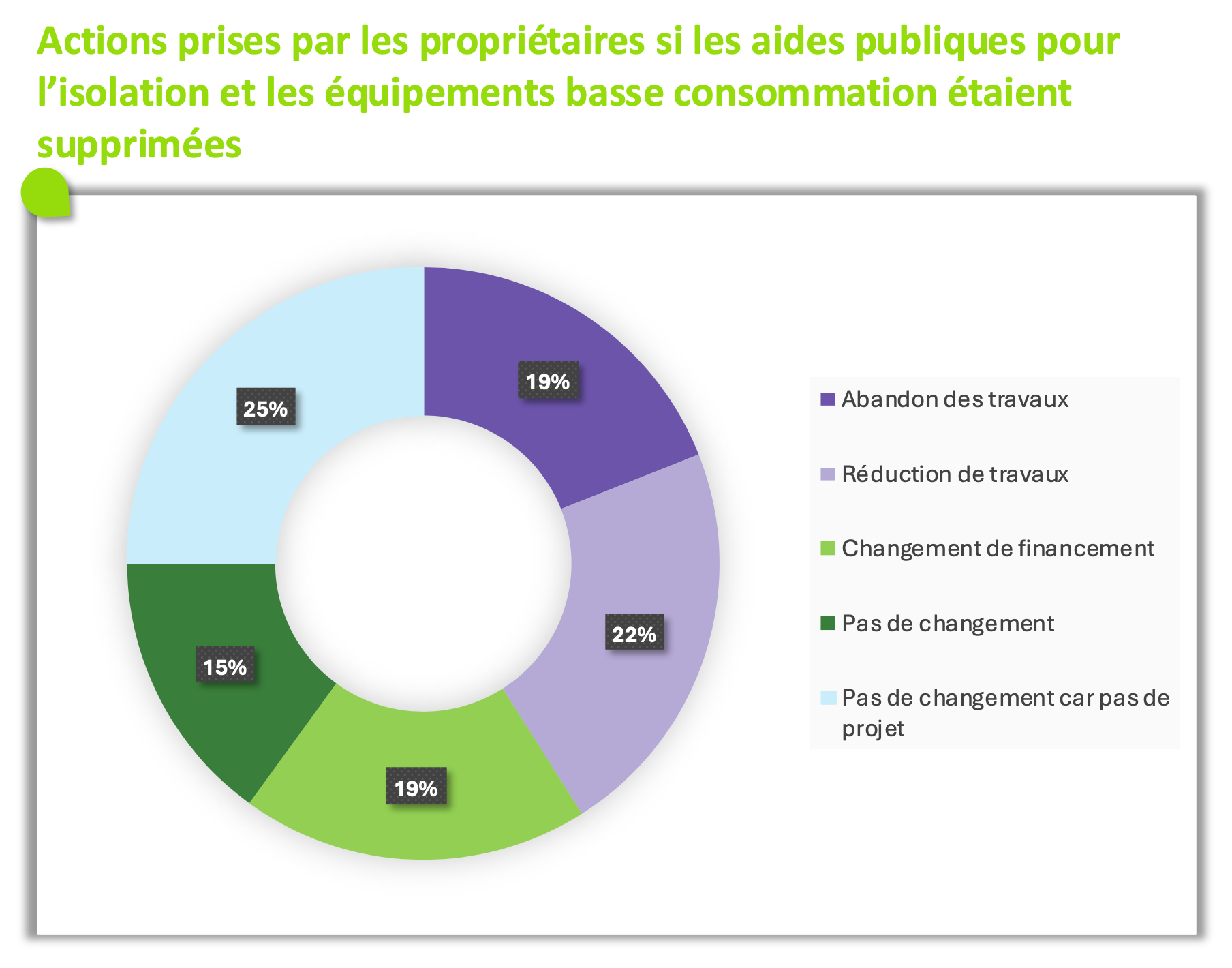 Répartition des actions prévues par les propriétaires si les aides publiques étaient supprimées L’image présente un diagramme en anneau représentant les actions que les propriétaires envisageraient si les aides publiques à l’isolation ou aux équipements basse consommation étaient supprimées. Les données affichées sont : Abandon des travaux : 19 %. Réduction des travaux : 22 %. Changement de financement : 19 %. Pas de changement : 15 %. Pas de changement car pas de projet : 25 %. Au total, une proportion importante de propriétaires réduirait ou annulerait les travaux en l’absence d’aides, tandis qu’un quart n’est pas concerné faute de projet.