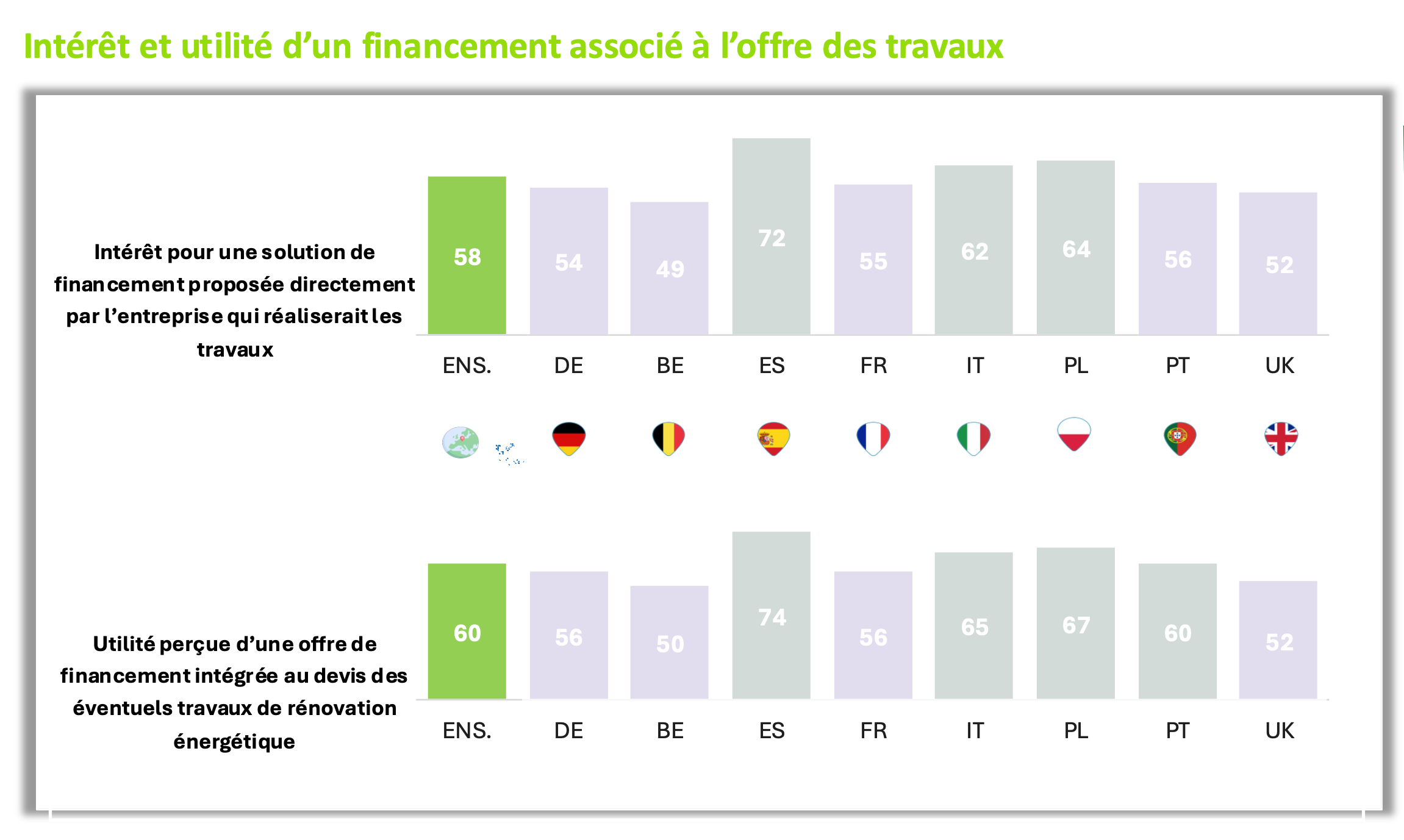 Présente l’intérêt et l’utilité perçus d’un financement intégré pour des travaux de rénovation L’infographie montre deux histogrammes alignés. Le premier indique l’intérêt pour une solution de financement proposée directement par l’entreprise réalisant les travaux. Le second mesure l’utilité perçue d’un financement intégré au devis de travaux de rénovation énergétique. Les valeurs sont indiquées pour l’ensemble des répondants et par pays. Intérêt pour une solution de financement proposée par l’entreprise Ensemble : 58 %. Allemagne : 54 %. Belgique : 49 %. Espagne : 72 %. France : 55 %. Italie : 62 %. Pologne : 64 %. Portugal : 56 %. Royaume-Uni : 52 %. Utilité perçue d’un financement intégré au devis Ensemble : 60 %. Allemagne : 56 %. Belgique : 50 %. Espagne : 74 %. France : 56 %. Italie : 65 %. Pologne : 67 %. Portugal : 60 %. Royaume-Uni : 52 %. Les résultats montrent un intérêt et une utilité perçue globalement élevés, particulièrement en Espagne, Pologne et Italie.