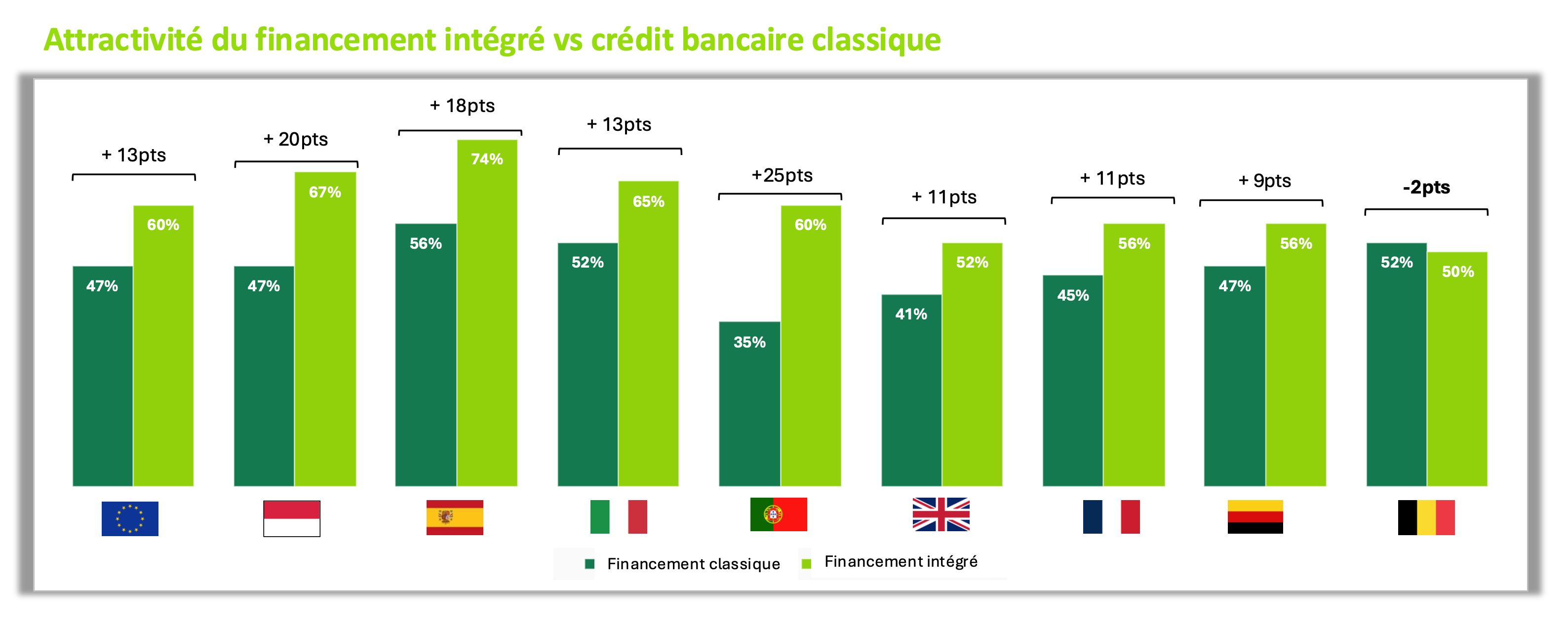 Compare l’attrait du financement intégré et du crédit bancaire dans plusieurs pays L’infographie présente un histogramme comparant la proportion de personnes jugeant attractifs deux modes de financement : le financement classique par crédit bancaire et le financement intégré proposé par l’entreprise réalisant les travaux. Les données sont organisées par pays. Les valeurs affichées sont : Union européenne : 47 % financement classique, 60 % financement intégré. Pologne : 47 % classique, 67 % intégré. Espagne : 56 % classique, 74 % intégré. Italie : 52 % classique, 65 % intégré. Portugal : 35 % classique, 60 % intégré. Royaume-Uni : 41 % classique, 52 % intégré. France : 45 % classique, 56 % intégré. Allemagne : 47 % classique, 56 % intégré. Belgique : 52 % classique, 50 % intégré. Dans la majorité des pays, le financement intégré est perçu comme plus attractif que le financement classique, avec des écarts importants en Espagne, Portugal et dans le pays représenté par le drapeau rouge-blanc. La Belgique constitue l’unique cas où le financement intégré est légèrement moins attractif.