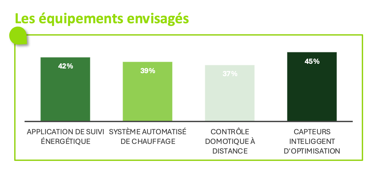 Intention d’équipement des ménages pour quatre dispositifs liés à la gestion de l’énergie. Le graphique présente les dispositifs que les ménages envisagent d’acquérir : Capteurs intelligents d’optimisation : 45 % Application de suivi énergétique : 42 % Système automatisé de chauffage : 39 % Contrôle domotique à distance : 37 % Tous les équipements sont envisagés par une proportion importante de répondants, avec une préférence pour les capteurs intelligents.