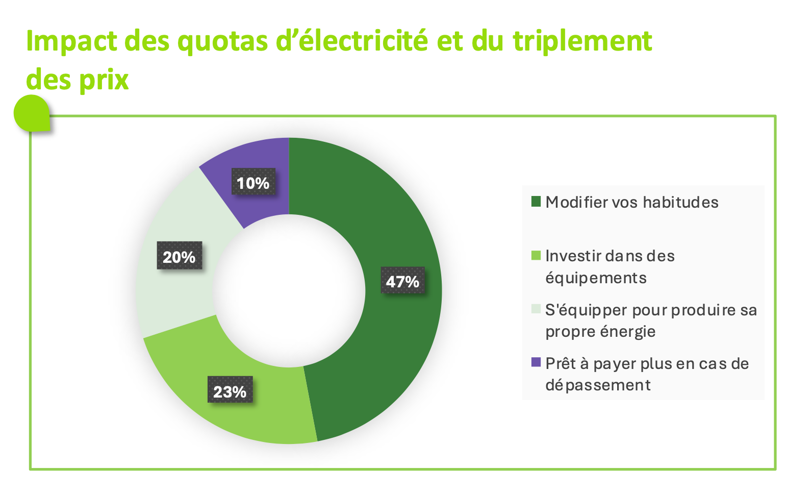 Camembert présentant la répartition des réactions envisagées face à des quotas d’électricité et un triplement des prix. Le graphique montre quatre réponses possibles face à un système de quotas d’électricité combiné à un triplement des prix. Les proportions sont les suivantes : 47 % déclarent qu’ils modifieraient leurs habitudes. 23 % envisageraient d’investir dans des équipements pour réduire leur consommation. 20 % chercheraient à s’équiper pour produire leur propre énergie. 10 % accepteraient de payer plus en cas de dépassement.