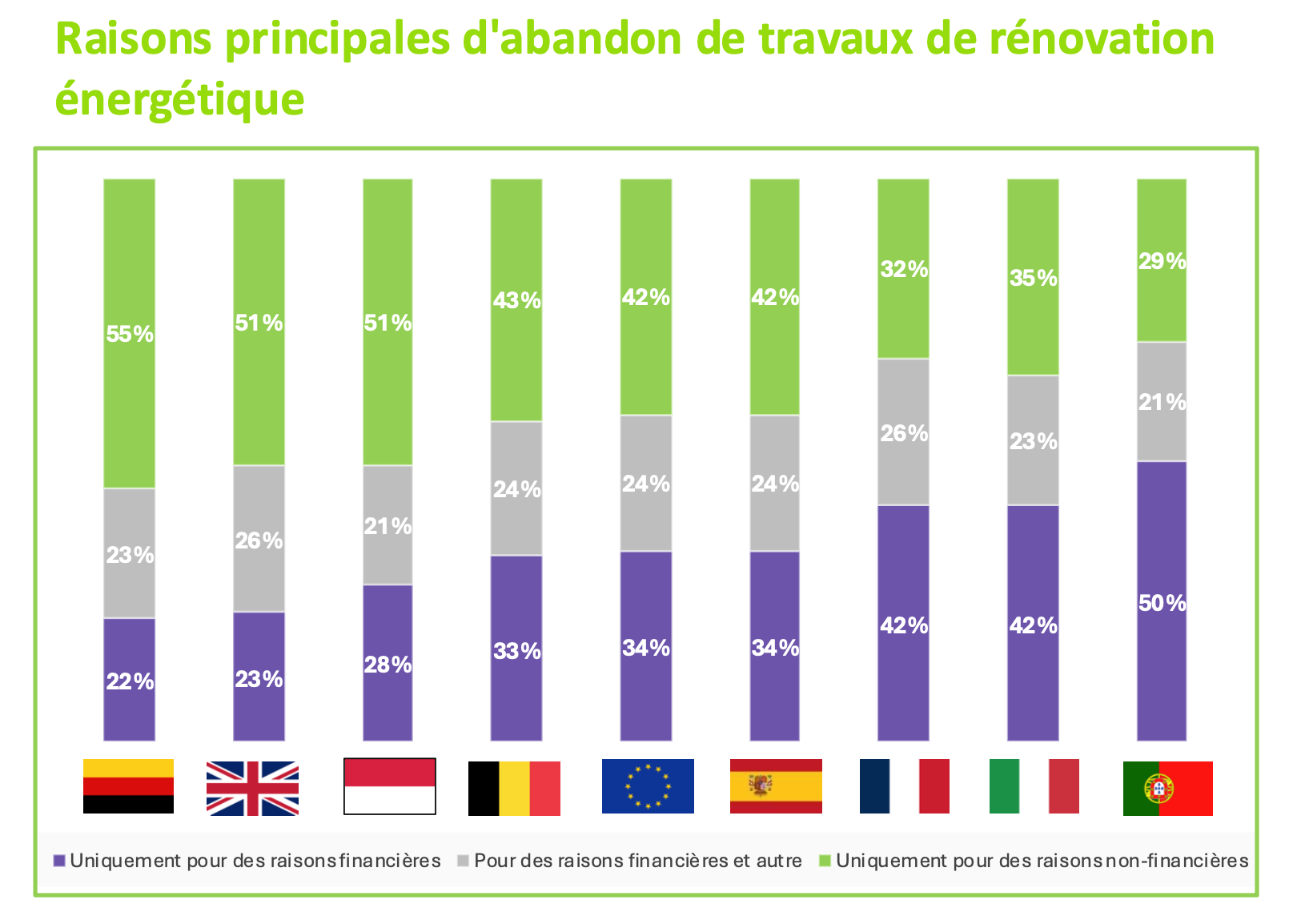 L’image présente des barres verticales empilées pour plusieurs pays européens, indiquant les raisons principales d’abandon de travaux de rénovation énergétique. Trois catégories apparaissent :