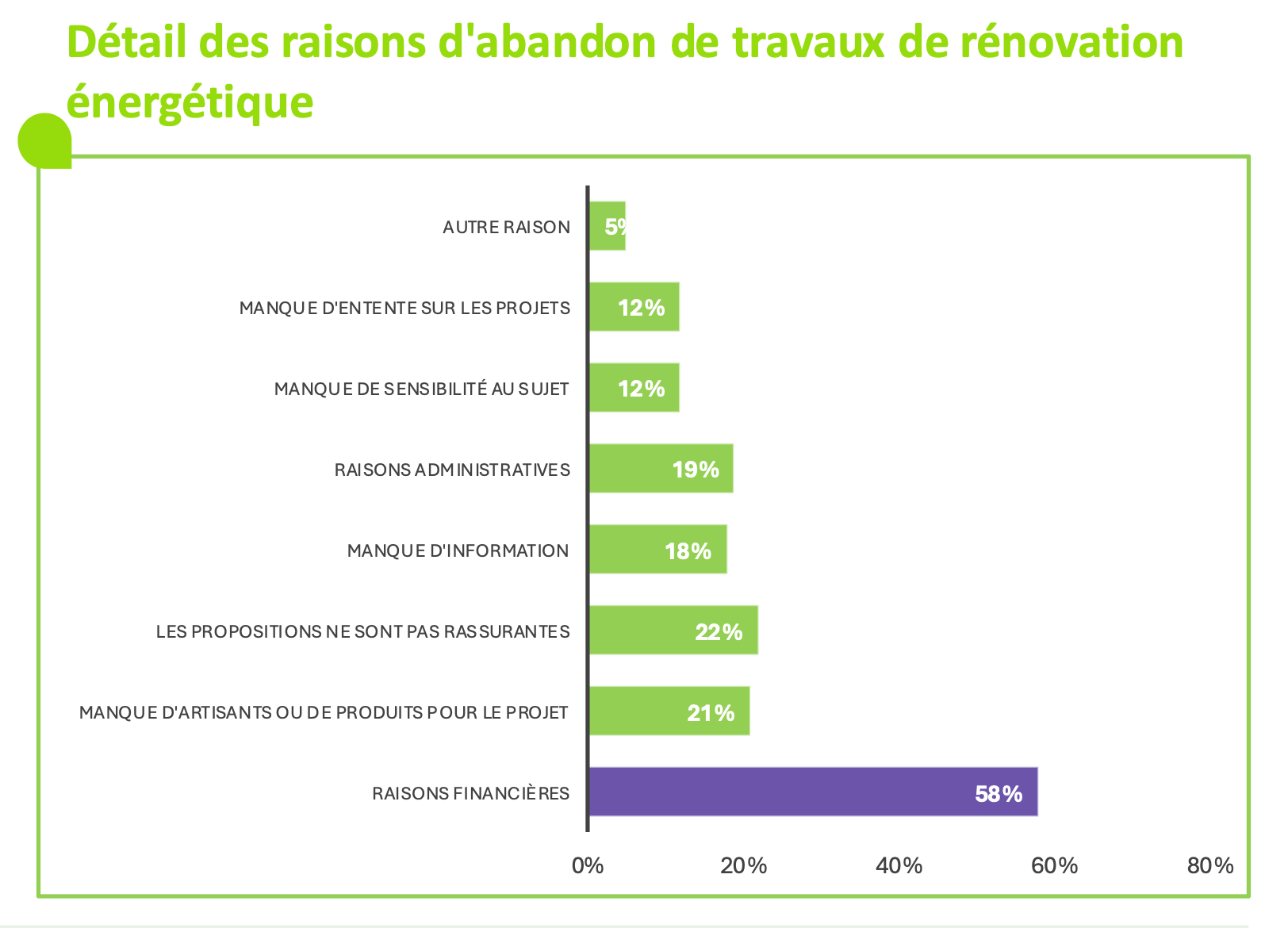 Le visuel présente un histogramme horizontal détaillant les raisons spécifiques d’abandon de travaux de rénovation énergétique.
