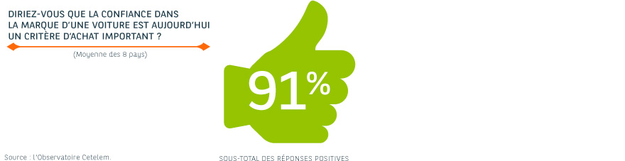 La confiance dans une marque est un critère d’achat important pour plus de neuf Européens sur dix. Les Turcs (97 %), Portugais (94 %), Espagnols (93 %) et Allemands (92 %) sont très sensibles à la marque automobile, tandis que les Belges (86 %), et dans une moindre mesure les Français (89 %) et les Britanniques (90 %), s’inscrivent en dessous de la moyenne des huit pays.