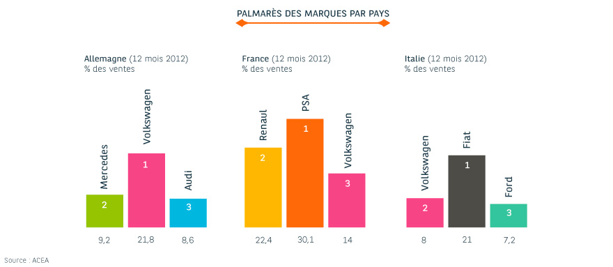 Un rapide tour d’horizon du palmarès des marques par pays permet de mesurer l’ancrage des constructeurs nationaux dans leurs marchés domestiques.