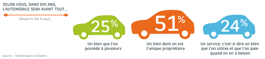 Dans dix ans, pour la moitié des Européens, l’automobile sera encore un bien dont on est l’unique propriétaire. Les autres prédisent qu’elle sera un bien que l’on possède à plusieurs ou un service auquel on aura recours le temps d’un besoin. Les 50 ans et plus figurent parmi les plus optimistes quant à l’évolution de la voiture vers un service (excepté en Allemagne), les 18-29 ans l’imaginent plutôt comme un bien que l’on possèdera à plusieurs.