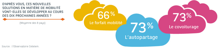 Au cours des dix prochaines années, trois quarts des Européens estiment que de nouvelles solutions de mobilité se développeront. Les Britanniques semblent moins convaincus que leurs voisins : ils sont « seulement » 59 % à voir un essor de l’autopartage et 62 % à prédire un développement du covoiturage, contre par exemple 79 % des Italiens et des Portugais sur l’autopartage et 83 % des Français sur le covoiturage. Le forfait mobilité est un peu moins plébiscité avec en moyenne 66 % des consommateurs en Europe qui pensent que cette solution peut se développer.