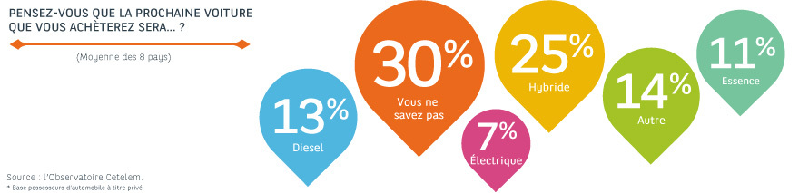 Pour autant, ces évolutions dans l’utilisation de la voiture ne se transformeront pas en révolution, car elle restera incontournable dans la mobilité quotidienne des Européens. Des Européens confiants, qui pensent que les constructeurs sauront innover pour proposer des véhicules moins polluants et moins gourmands en énergie. Si 30 % des Européens ne savent pas à quoi roulera leur prochaine voiture, ils sont 25 % à penser qu’ils conduiront un véhicule hybride, très loin devant la voiture électrique (7 %).