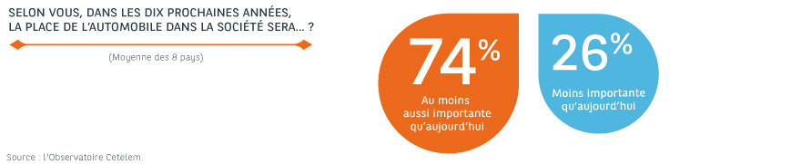 Lorsqu’ils se projettent sur les dix prochaines années, les Européens n’anticipent pas de révolution quant à la place de l’automobile dans nos sociétés : pour les trois quarts d’entre eux, elle conservera une place au moins aussi importante qu’aujourd’hui. Néanmoins, un quart d’entre eux s’attendent à une érosion de sa place : ils sont plus nombreux à le penser en Italie (37 %), en Turquie (34 %) et au Portugal (28 %).