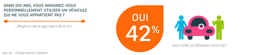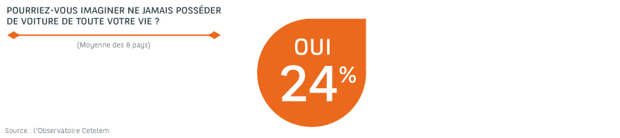 24 % des Européens imaginent ne jamais posséder de voiture, avec des disparités importantes entre les pays. En effet, 30 % des consommateurs au Royaume-Uni pourraient suivre cette voie, mais ils sont seulement 14 % en France.