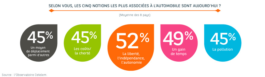 Quand on interroge les consommateurs sur leur perception de l’automobile il y a vingt ans, les notions liées à la réussite sociale (52 % pour la moyenne des huit pays) et au luxe (48 %) arrivent en tête, signe que l’automobile était perçue avant tout comme un objet de convoitise. Les notions de liberté, d’indépendance, d’autonomie (37 %), de plaisir (32 %) et de gain de temps (29 %) suivent immédiatement.