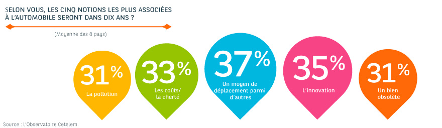 Les cinq notions les plus associées à l’automobile dans dix ans révèlent une perception brouillée de l’automobile. Un moyen de déplacement ressort à la première place 37 %), suivi par l’innovation (35 %), puis par les coûts (33 %). La pollution (31 %) et un bien obsolète (31 %) referment le top 5 des Européens. À l’avenir, la cherté automobile se maintiendra dans l’esprit des Britanniques (première place) et se renforcera pour les Allemands et les Belges (deuxième place aujourd’hui, première dans dix ans). En Turquie, la notion de pollution passera du cinquième rang aujourd’hui au premier rang dans dix ans. Les Italiens pensent que l’automobile sera un bien obsolète dans dix ans. Contrebalançant cette vision, les Espagnols, les Français et les Portugais associent le concept d’innovation (premier rang) à l’automobile dans dix ans.