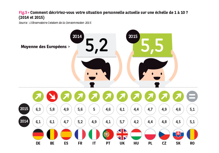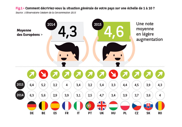 Pour la 2e année consécutive, la perception qu’ont les Européens de la situation générale de leur pays s’améliore, après s’être dégradée cinq années de suite. La note moyenne des pays suivis par l’Observatoire Cetelem passe cette année de 4 à 4,3 et se situe à mi-chemin entre le point le plus bas de 2013 et le niveau d’avant-crise.