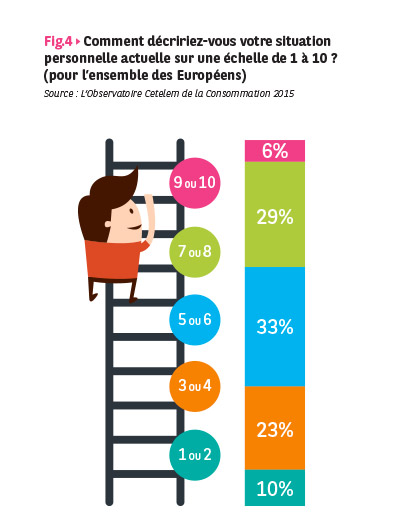 Au total, les Européens se répartissent en trois tiers. Un tiers donne une note de situation personnelle comprise entre 1 et 4, un tiers voisine de 5 ou 6, un tiers supérieure ou égale à 7.