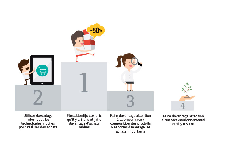 73 % des Européens « utilisent davantage qu’il y a 5 ans Internet et les technologies mobiles pour réaliser des achats », changement dans les pratiques qui occupe la seconde marche du podium. Les européens sont aujourd’hui pleinement aguerris à Internet et aux technologies mobiles comme vecteurs de consommation, et ce, à tous les âges de la vie… Avec quelques écarts : si 80 % des moins de 45 ans l’affirment, ils sont aussi 70 % des 46-60 ans et même 63 % des plus de 60 ans à confirmer ce fait.