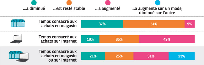 2 – Pour les consommateurs faisant autant d’achats aujourd’hui qu’il y a cinq ans, le temps consacré aux achats est en pleine recomposition. D’une part, il augmente globalement en raison du temps passé sur Internet à préparer ses achats, ce dernier s’étant accru pour quasiment 1 consommateur sur 2. D’autre part, il est parfois arbitré par une présence en magasin plus courte pour 20 % des consommateurs de cette catégorie.