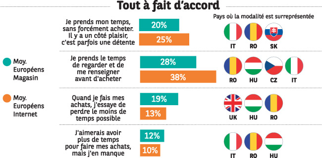 Décrivant l’esprit dans lequel ils réalisent leurs achats en magasin ou sur Internet, les Européens clament haut et fort qu’ils sont prêts à consacrer du temps aux achats. Certains se plaisent même à « l’étirer », notamment sur Internet.