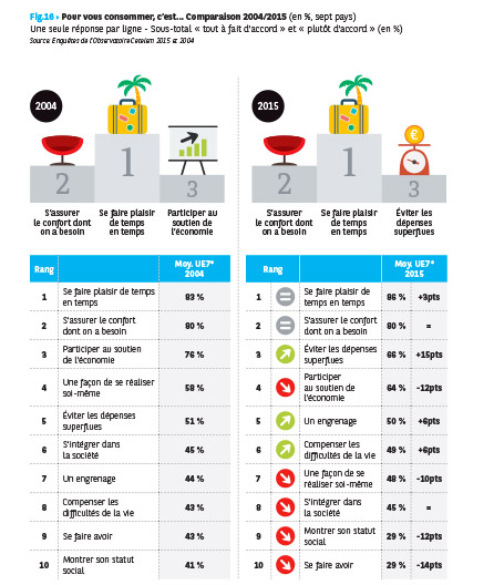 L’item « « éviter les dépenses superflues » connaît la plus forte progression, signe d’un processus de rationalisation des achats chez le consommateur. Cependant, plus de vigilance ne signifie pas pour autant désenchantement. La consommation offre une soupape au quotidien et est vécue comme une échappatoire, une manière de « compenser les difficultés de la vie ».