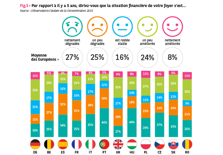Plus de 40 % des Allemands, des Britanniques et des Roumains estiment à l’inverse avoir vu leur situation financière s’améliorer depuis 5 ans, de même que 32 % à 38 % des Belges, des Slovaques, des Tchèques et des Polonais.