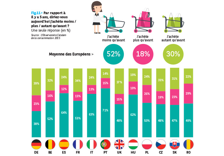 Plus d’un Européen sur deux estime acheter moins qu’il y a 5 ans. Mais ils sont aussi près d’un sur 5 à acheter plus aujourd’hui qu’en 2009 !… Il reste donc moins d’un tiers des consommateurs à considérer avoir maintenu leur niveau de consommation.