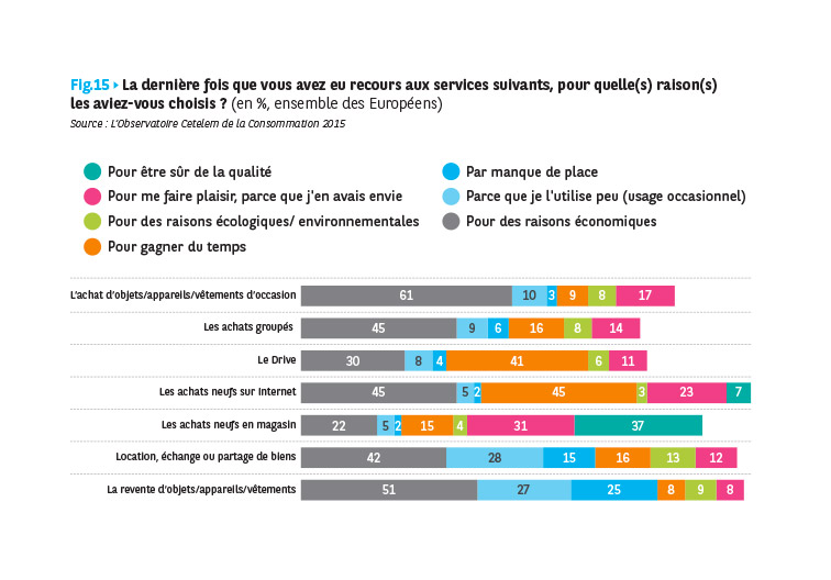 Sans surprise, les raisons économiques sont invoquées comme le principal motif du recours aux achats sur Internet, à la seconde main et même aux pratiques collaboratives. Elles sont citées par 40 % à 60 % des consommateurs européens.